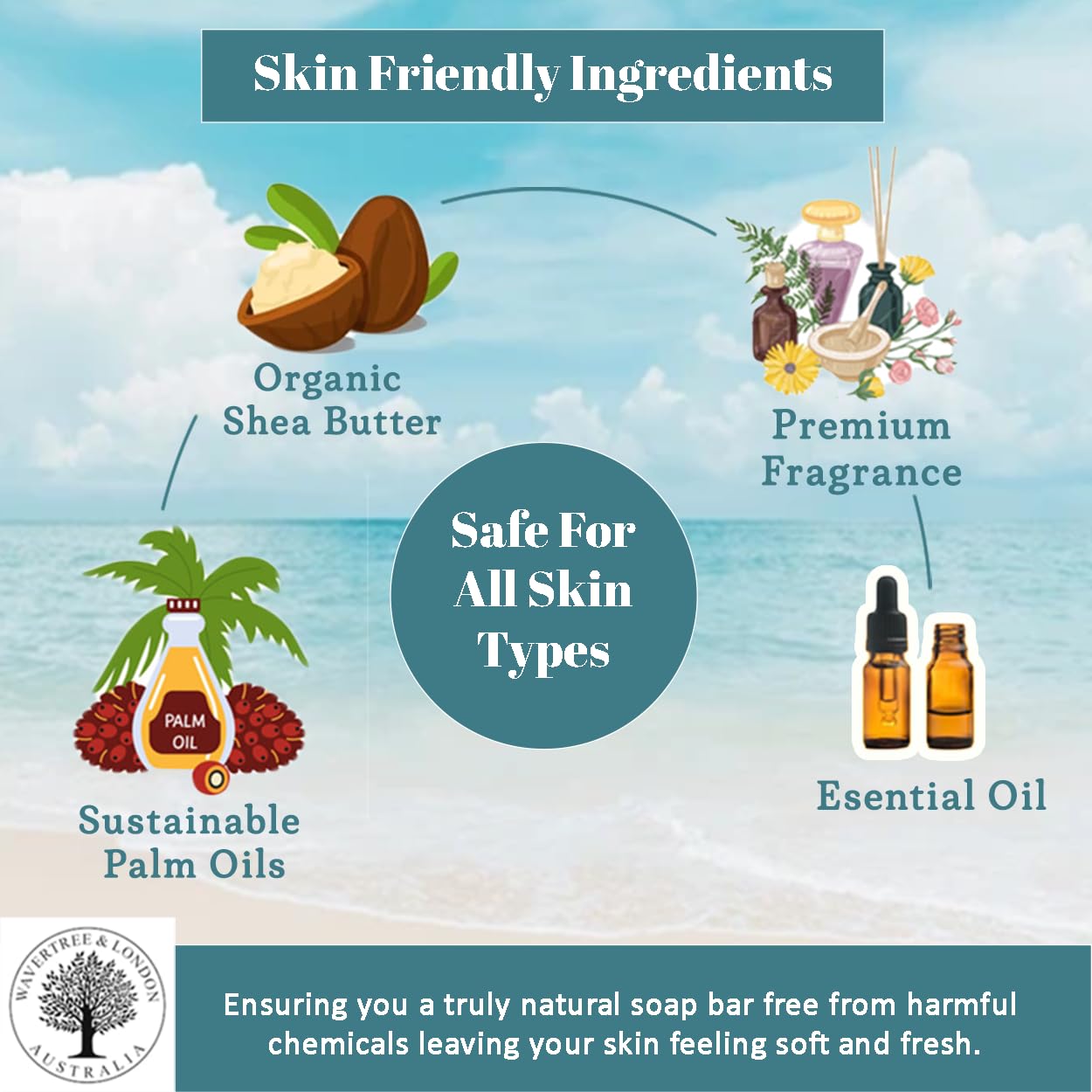 Wavertree & London Beach Scented Natural Soap (8 Bars), 7oz Moisturizing French Triple Milled Soap Bars enriched with shea butter - Pure Plant Oil Bath & Body Bars for All Skin Types