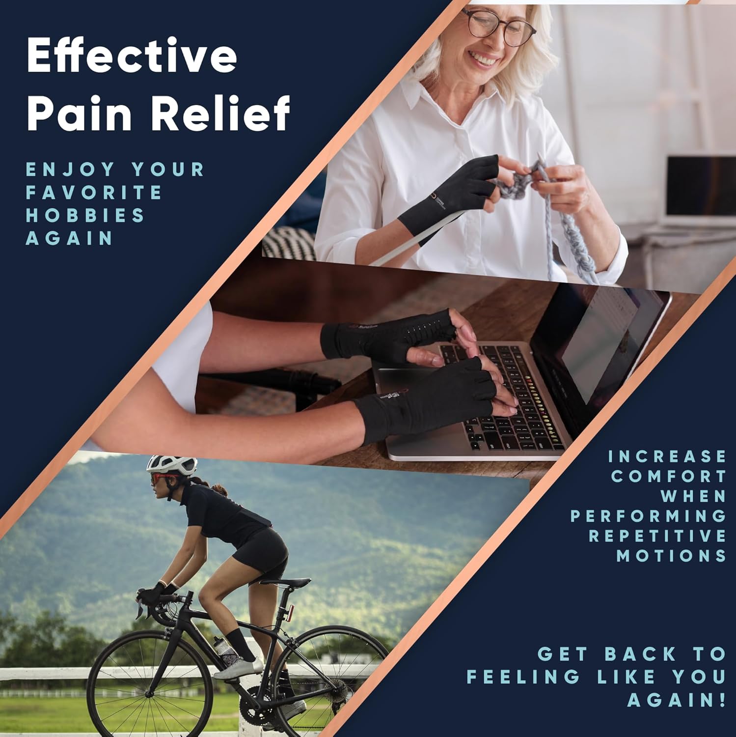 - FIND THE STRENGTH TO HEAL. Copper Compression's Arthritis Gloves provide you with the compression you need to help reduce swelling and pressure, increase blood flow, restrict excess fluid build-up, and relieve aching and soreness in joints. The therapeutic value of these fingerless gloves provides support in managing medical conditions such as: arthritis, carpal tunnel, tendonitis, typing, texting, purlicue pain and repetitive stress injuries.