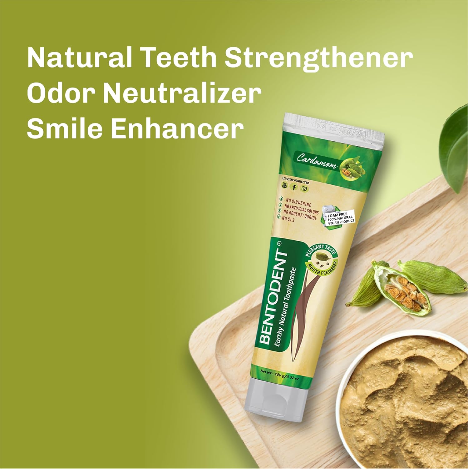 BENTODENT Fluoride Free Remineralizing Calcium Bentonite Clay Toothpaste - Cardamom Flavor Natural Toothpaste, Mint-Free, 3.52 oz - Mineral Tooth Paste Ideal for Sensitive Teeth & Whitening