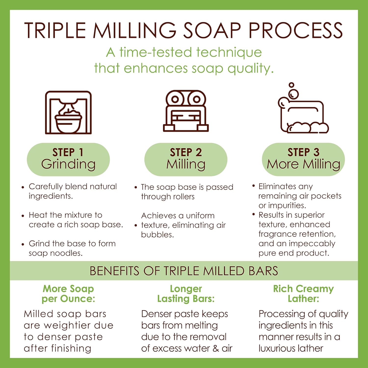 - French Triple Milled Soap, Lemon Myrtle and Lemongrass Soap Bar. Crafted in Australia with the French tradition and triple-milled process, our luxury soaps for women are refined for purity and smoothness. Once the soap goes through the double refiner, the result is a dense and long-lasting soap with a creamy lather and fragrance that lasts.