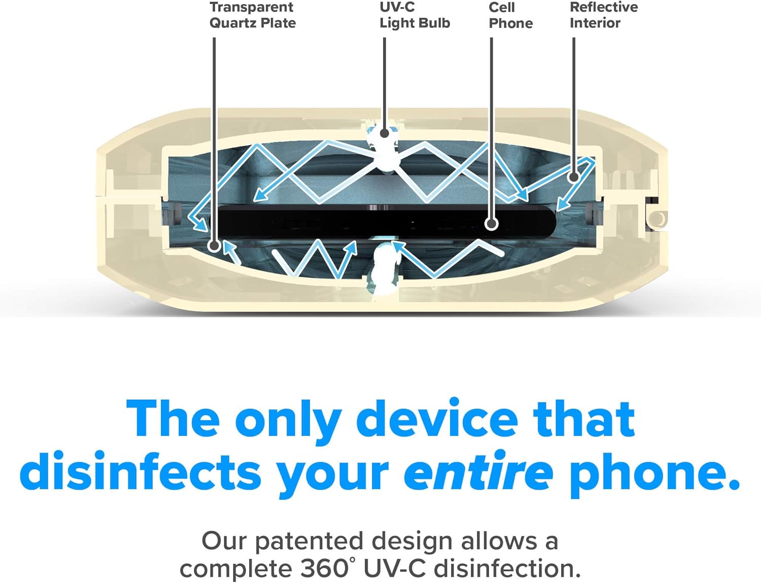 - 360-Degree Disinfection; Our unique, patented design ensures powerful, germicidal UV-C light reaches all sides and surfaces of objects placed inside. Our combination of chamber design, selective materials, and bulb placement makes our phone sanitizer and charger box one of the best phone accessories.