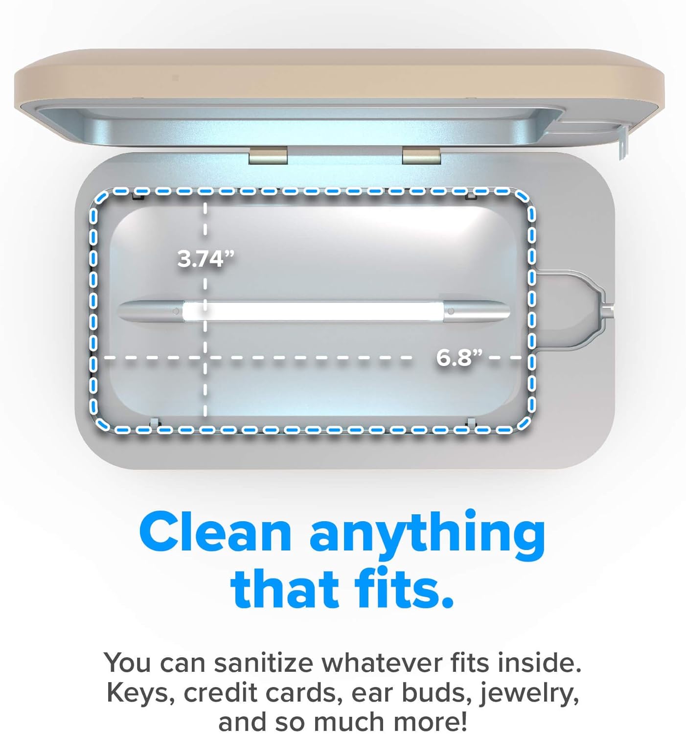- Disinfects More than Just Phones; The PhoneSoap 3 fits all smart phones - even larger models like the iPhone 8+ or Galaxy S10+ - and can disinfect more than just phones. Add your keys, wallets, headphones, jewelry, glasses, and more. Interior Dimensions: 6.8 x 3.74 x 0.78 in.