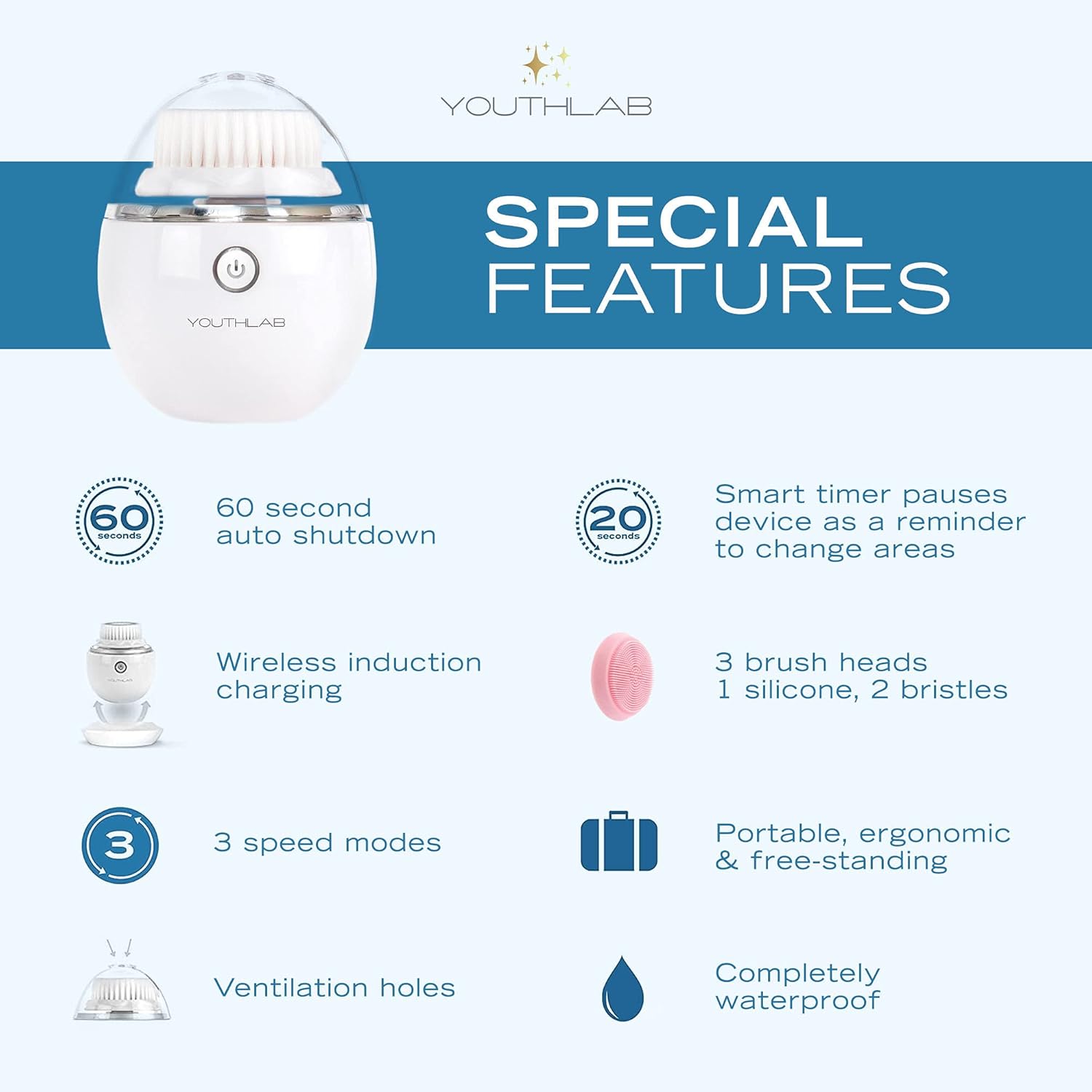 YouthLab Pure Radiance, Vibrating Facial Cleansing Brush, Electric, 3 Modes, 3 Brush Heads (2 Bristle,1 Silicone), Waterproof, Rechargeable, Smart Timer, Exfoliating, Massage (Silver)