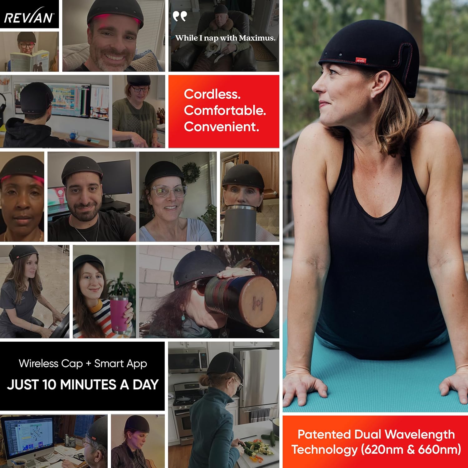 - JUST 10 MINUTES A DAY: Utilizing patented Dual-Wavelength Technology, REVIAN Red, uses red (660 nm) and orange (620 nm) wavelengths of light to promote blood flow and inhibit DHT production, creating an optimal environment for natural hair growth