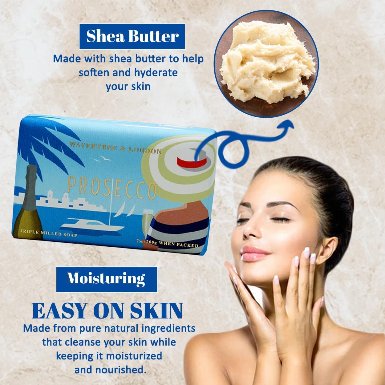Wavertree & London Prosecco Scented Natural Soap Bar, 7oz Moisturizing French Triple Milled Soap Bar for Women & Men enriched with shea butter - Pure Bath & Body soap bar for All Skin Types
