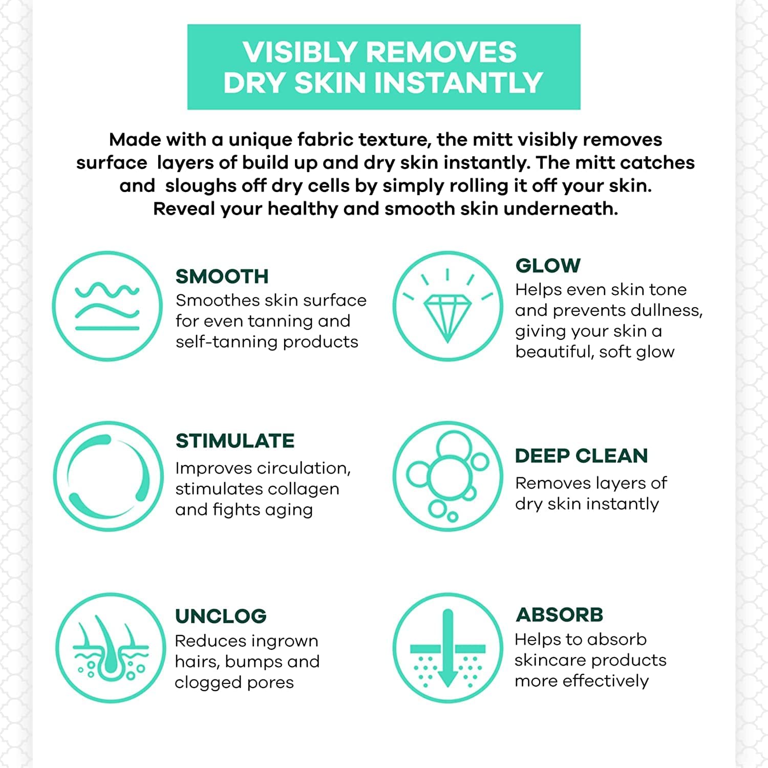 - AT-HOME SPA TREATMENT: Use the Dermasuri exfoliation mitt to deeply exfoliate your skin without harmful chemicals - only water. Experience deep cleansing to remove dead skin cells, even out your skin tone, scrub away dry skin, and stimulate blood flow. Treat yourself and your friends with this luxurious skincare tool.