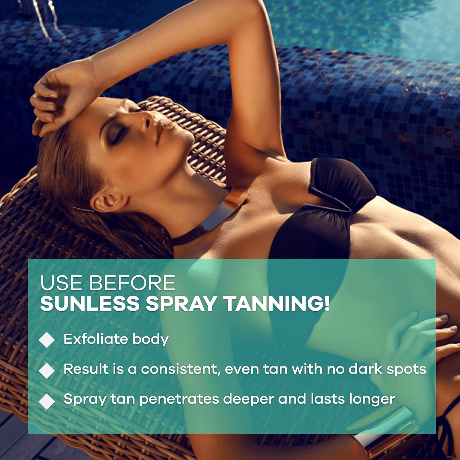 - EXTEND THE LIFE OF SUNLESS TANNING - For a long-lasting, smooth, glowing tan with no dark spots, use our skin exfoliator on your back, neck, legs, or anywhere you apply the tanner. Exfoliate before spray tanning or applying sunless tanning lotions.
