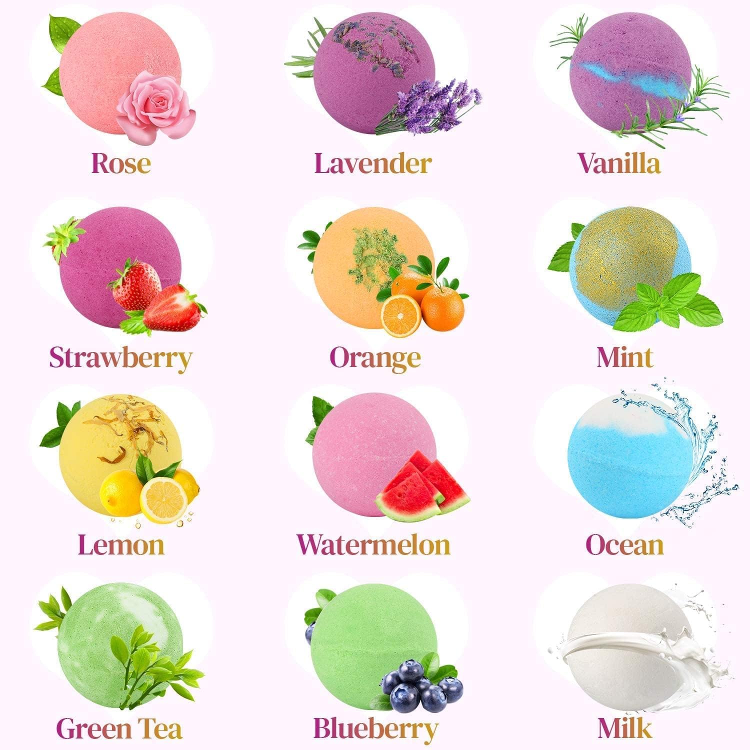 - 【Fizzy with 12 Essential Oil】Rich in 12 kinds of 100% organic essential Oils: rose, vanilla, lemon, lavender, watermelon, blueberry, spearmint, green tea, strawberry, milk, ocean, orange