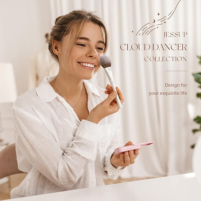 - Unique Design Make up Brushes: The pearl-white small waist handle matching with brown & white bristles looks like a lady dressed in a fishtail skirt, luxurious and elegant. 100% premium vegan Jessup exclusive fibers, great for cream, liquid products, and lighter powder applications. All brushes are dense, soft and fluffy, no shedding, great blending and spread evenly. They are designed to better hold, apply and blend a variety of makeup products to create a perfect makeup looks.