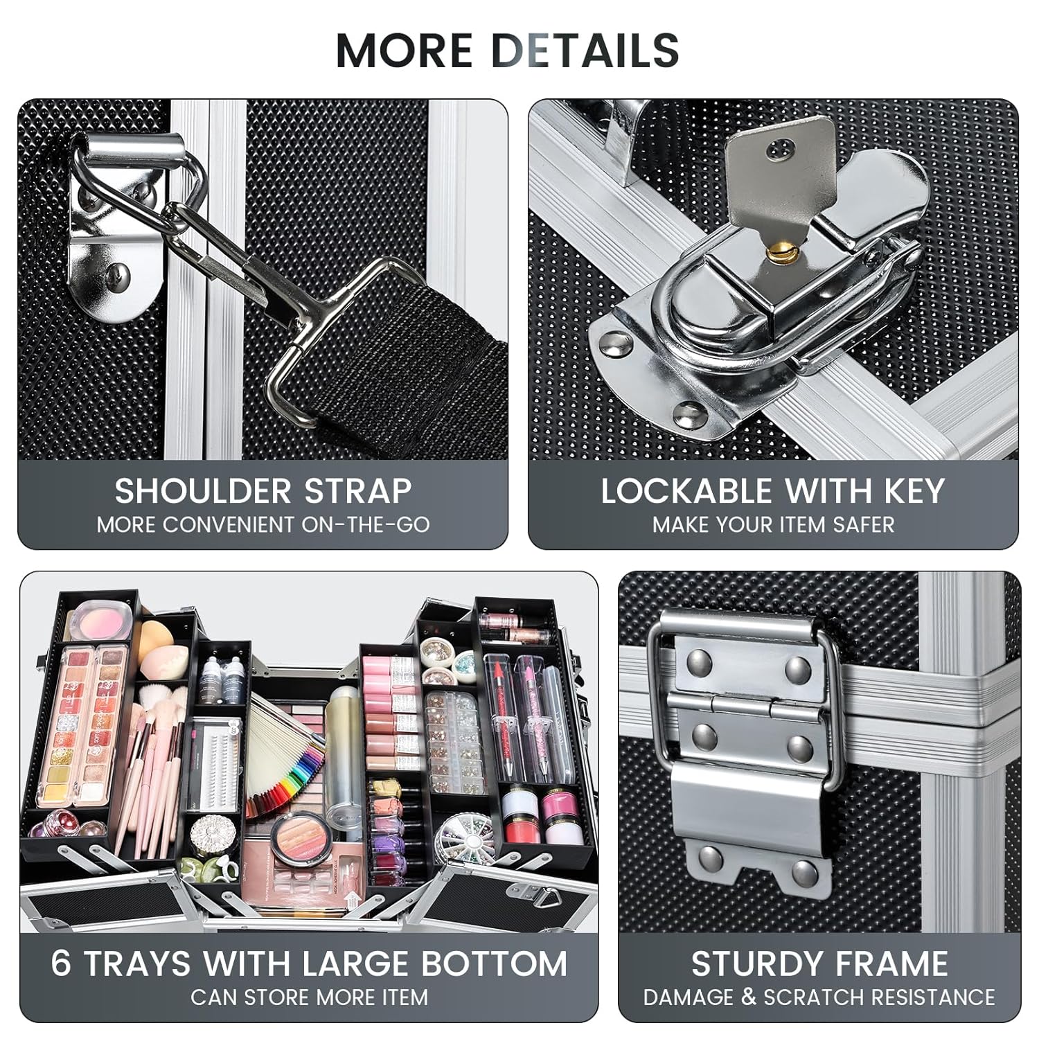- Makeup Train Case with 6 Trays: The extendable cantilever 6-tray structure with dividers. According to the different sizes of gadgets can be fixed to prevent shaking and falling damage. Its flexible storage options accommodate various cosmetics, from daily toiletries to nail polishes, essential oils, jewelry, paintbrushes, and crafting tools. The large bottom space is ideal for palettes and travel-size bottles, keeping everything organized and easily accessible.