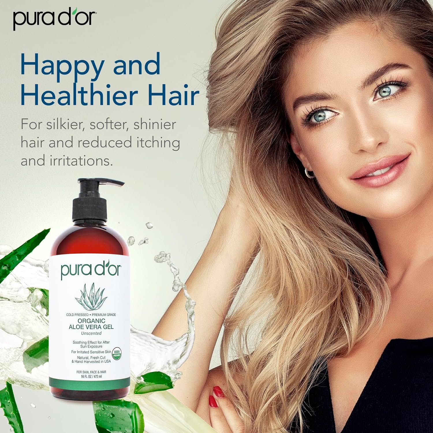 PURA D'OR 16 Oz ORGANIC Aloe Vera Gel - Unscented - All Natural - ZERO Artificial Preservatives - Deeply Hydrating & Moisturizing - Sunburn, Bug Bites, Rashes, Small Cuts, Eczema Relief - Skin & Hair