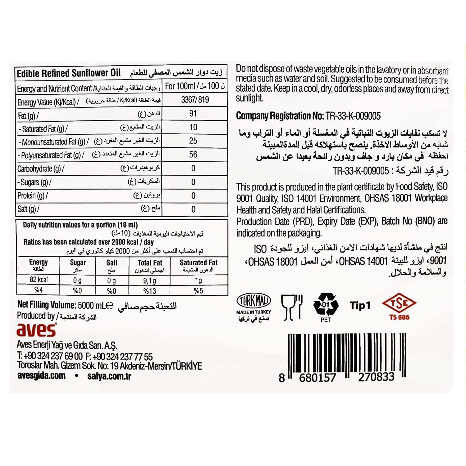 Safya - 100% Pure Sunflower Oil, (5 L) 1.32 Gallon