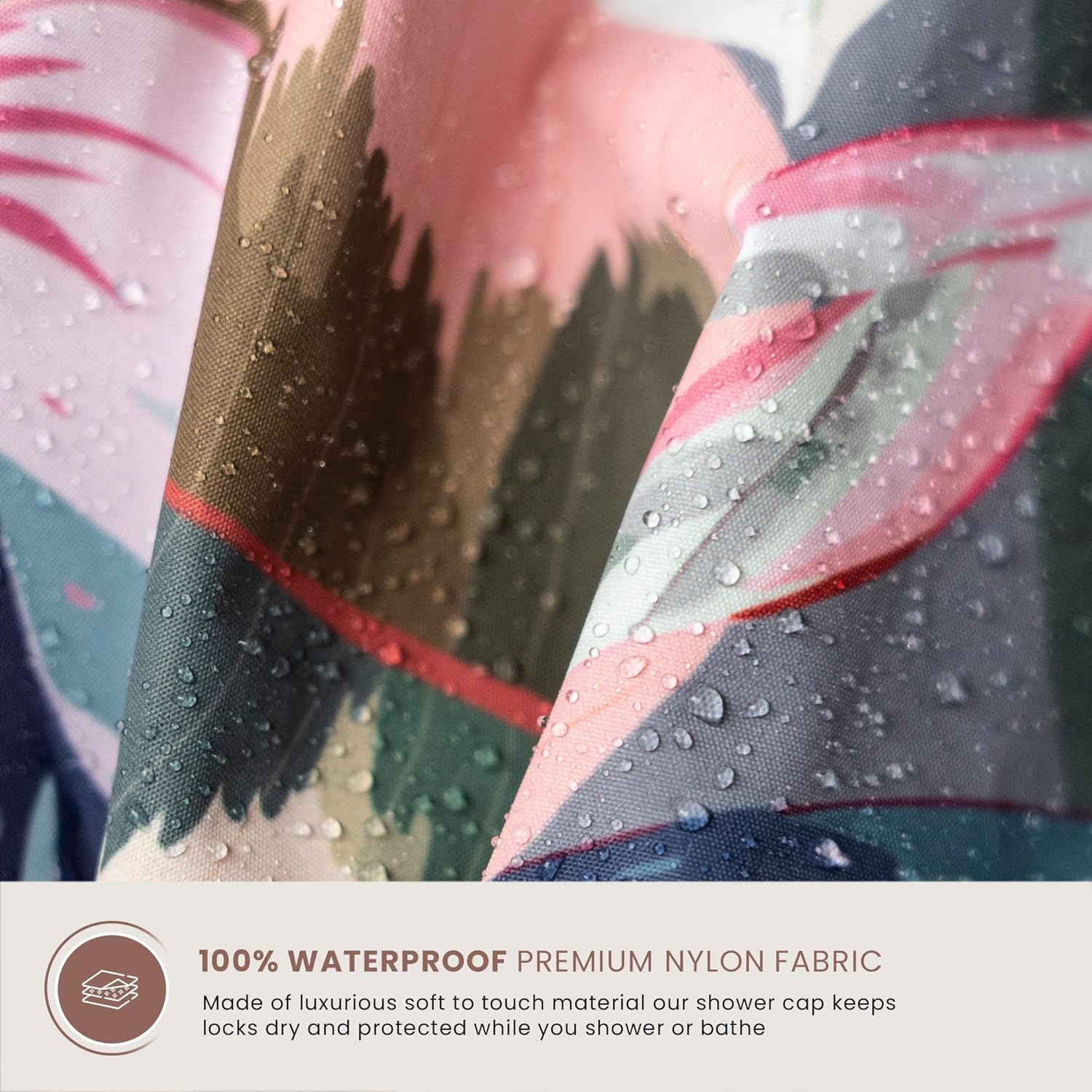 - THE AVERAGE SHOWER HAIR CAP is poorly made with flimsy materials, FALLING APART after a few uses. Crafted out of DURABLE, 100% waterproof polyester with a LIGHTWEIGHT, BREATHABLE feel, our washable shower cap is SOFT TO THE TOUCH and resistant to wrinkling & tearing. So you can count on it for LONG-LASTING PROTECTION against moisture – and say bye to the WASTEFUL CYCLE of plastic hair caps.