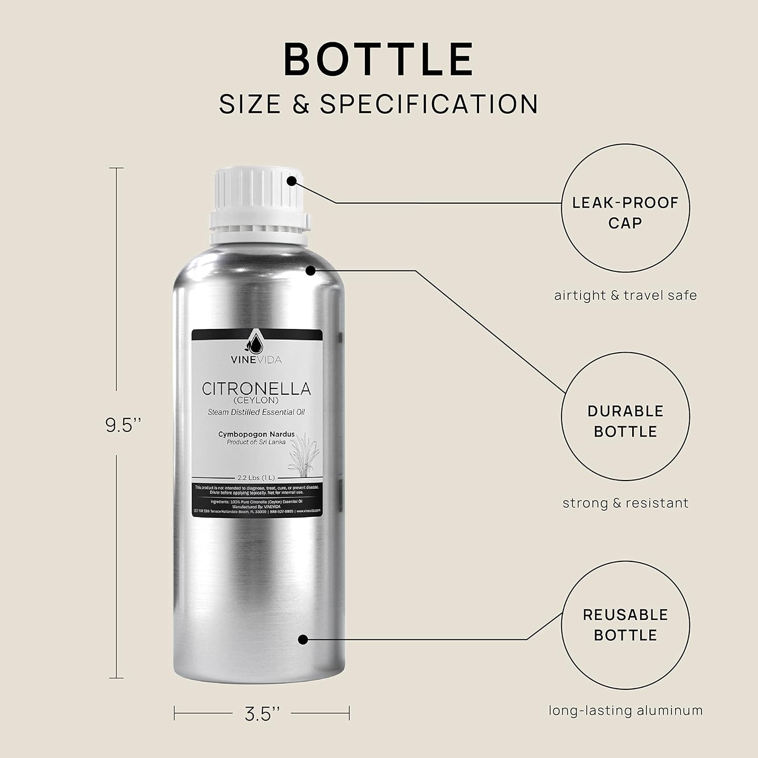 VINEVIDA Citronella Ceylon Essential Oil 32 oz - Undiluted Citronella Oil 32 oz - Citronella Candle Oil Scent - DIY Candle Scents for Candlemaking - Bulk Essential Oil for Soap Making Safe for Skin