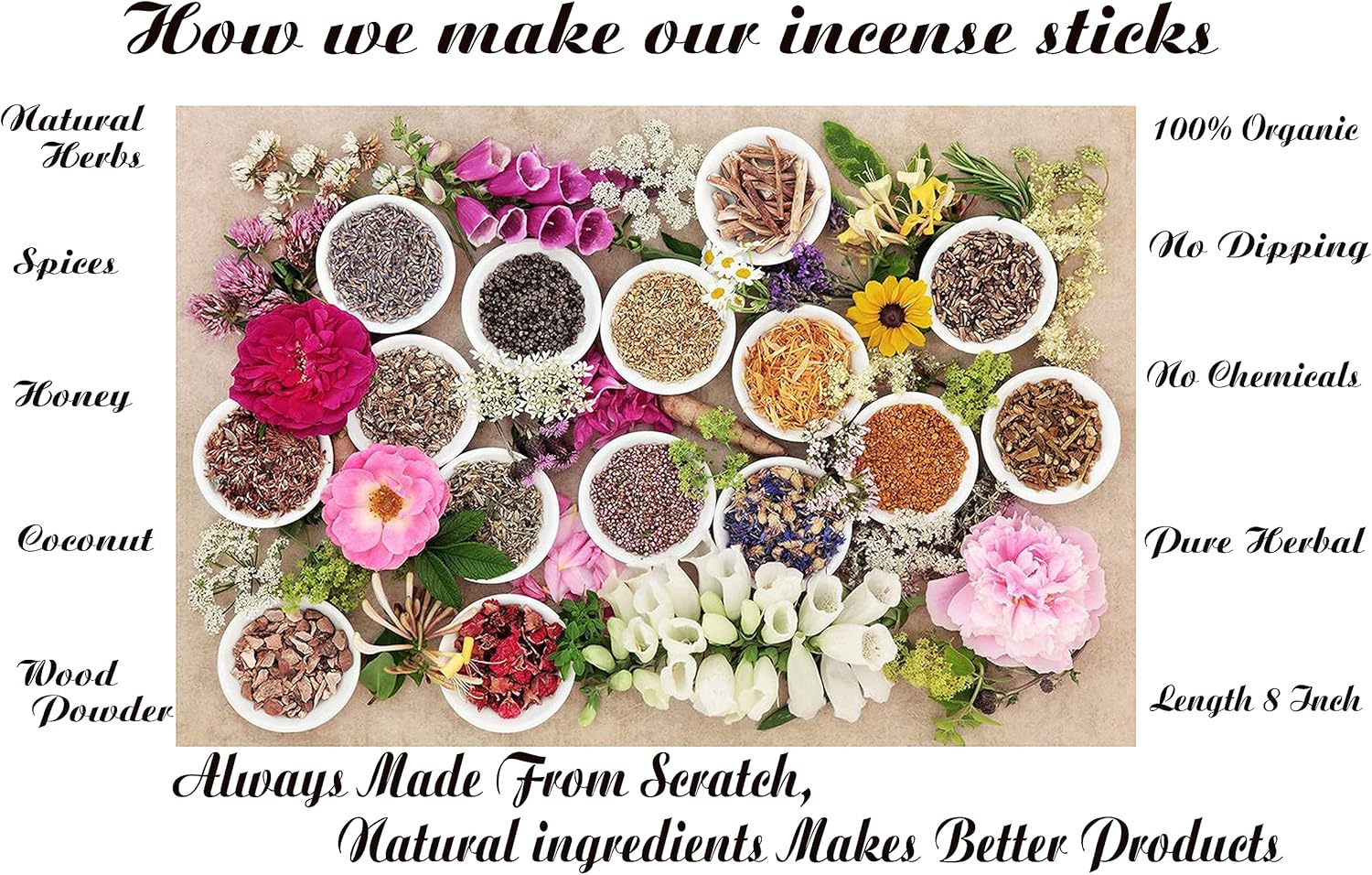 - ๐ 100% NATURAL -Natural incense Sticks completely handmade MADE FROM SCRATCH by blending natural resins, Herbs, Spices with aromatic wood powders, charred coconut powder fragrant oils and honey. No Dipping in Toxic Chemicals