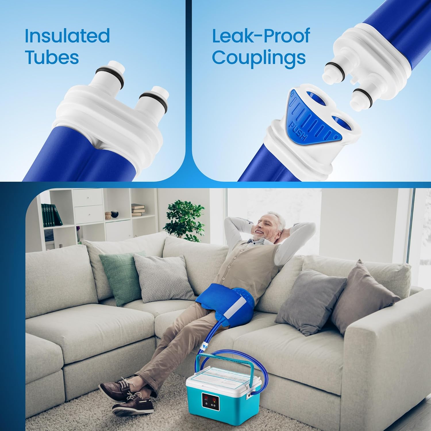 - PROFESSIONAL THERAPY IN THE COMFORT OF YOUR HOME — The Cold Therapy System by PhysioNatural includes a 9-quart cooling reservoir, whisper-quiet pump technology, a 7.2’ insulated tube, and a large cold therapy pad that conforms to your hip and back. The cooling reservoir is equipped with a digital panel, which allows you to monitor your therapeutic temperature and set an automatic shutoff, if desired, for 20, 40, or 60 minutes. Simply add ice and water to the cooler and enjoy effective relief.