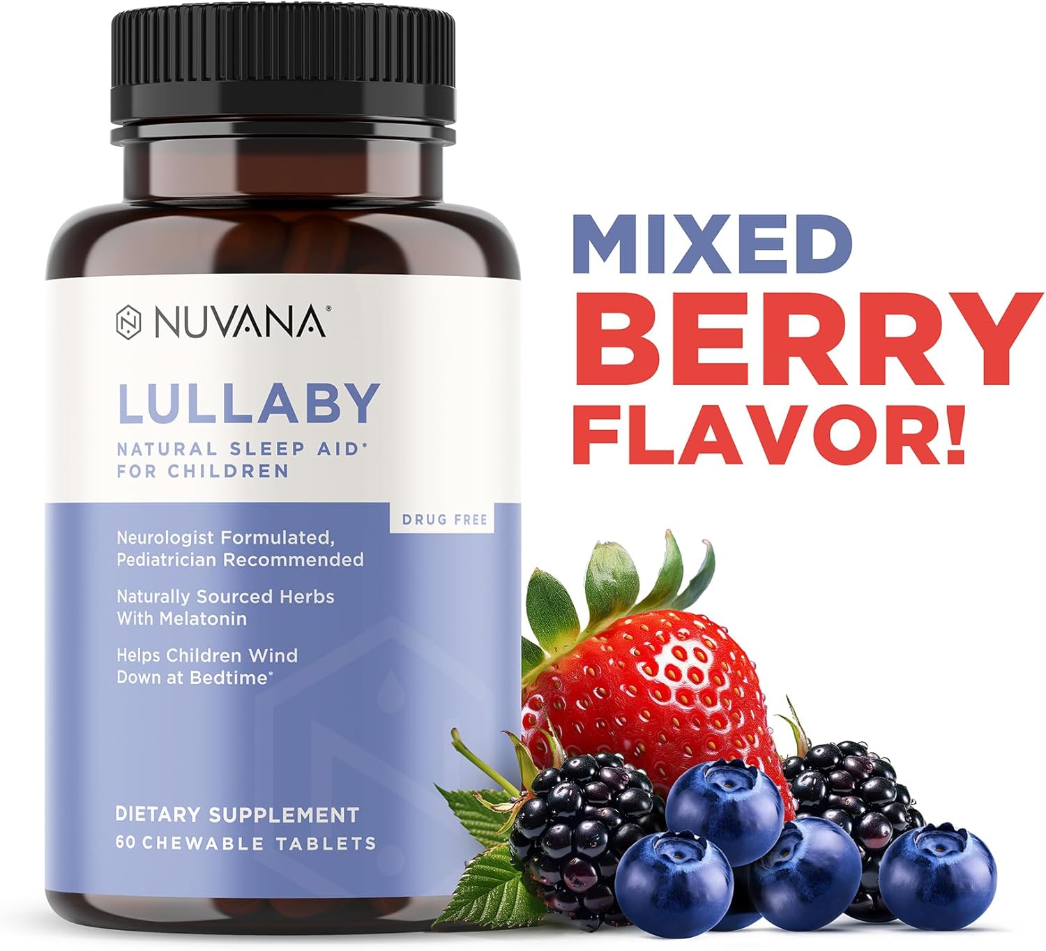 - SAFE & SOUND SLEEP: This unique blend of melatonin, lemon balm, passionflower, valerian root, and chamomile, work together to calm your child's mind and promote tranquility at bedtime. Give your child the peaceful and restorative sleep they need with Nuvana Lullaby. Our berry-flavored herbal sleep aid is non-habit forming, drug-free, and safe for children aged 3 and up. Help your little ones wake up refreshed and ready for the day with Nuvana Lullaby.