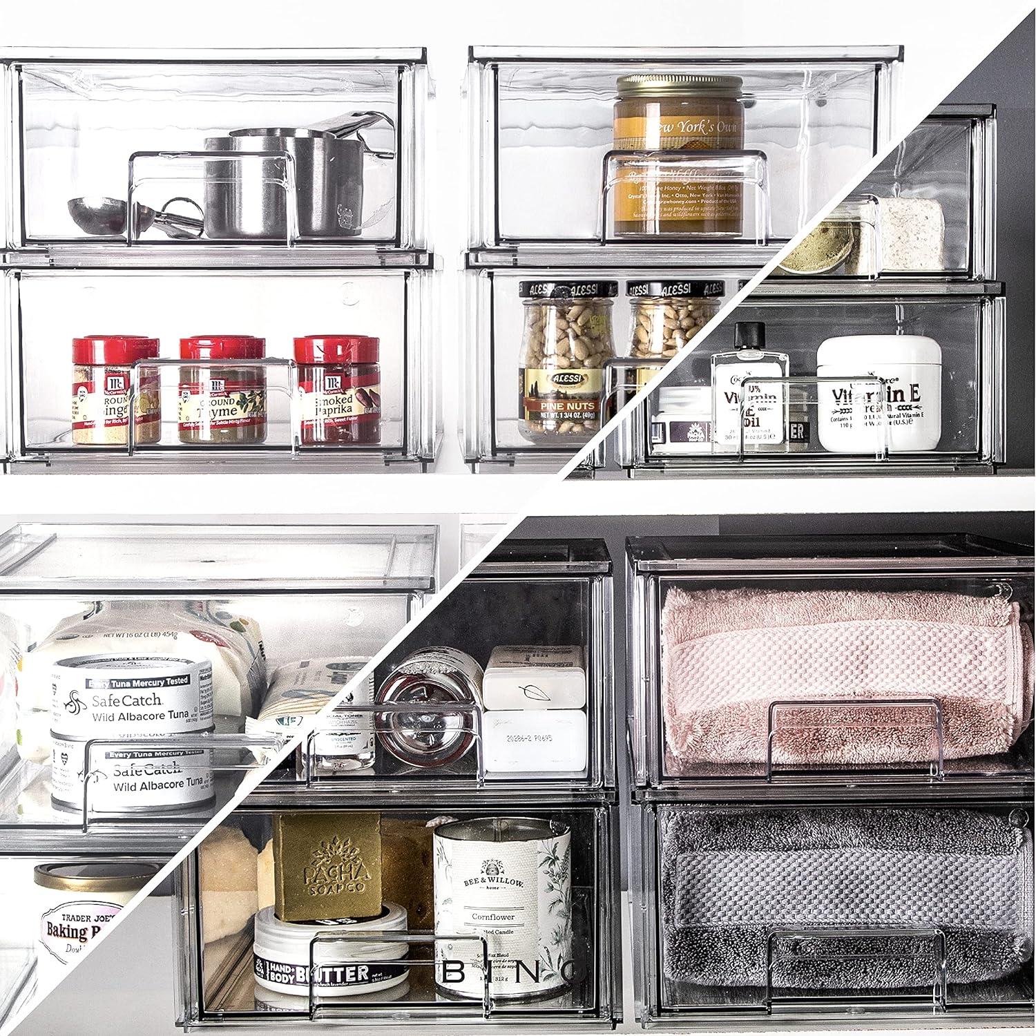 - Space-Saving Clarity: BINO's clear stackable storage drawer is your key to maximizing home organization. These durable Large drawers not only fit seamlessly into pantry shelves and fridge spaces but also have a low-profile design that slots into any nook or cranny, making the most of your available space. Say goodbye to clutter and hello to sleek, organized living.