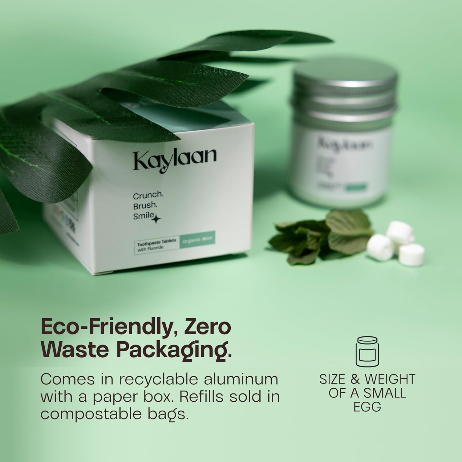 - Chewable, bite-sized tabs: No paste, no mess! Compact tablets in zero-waste, compostable packaging.