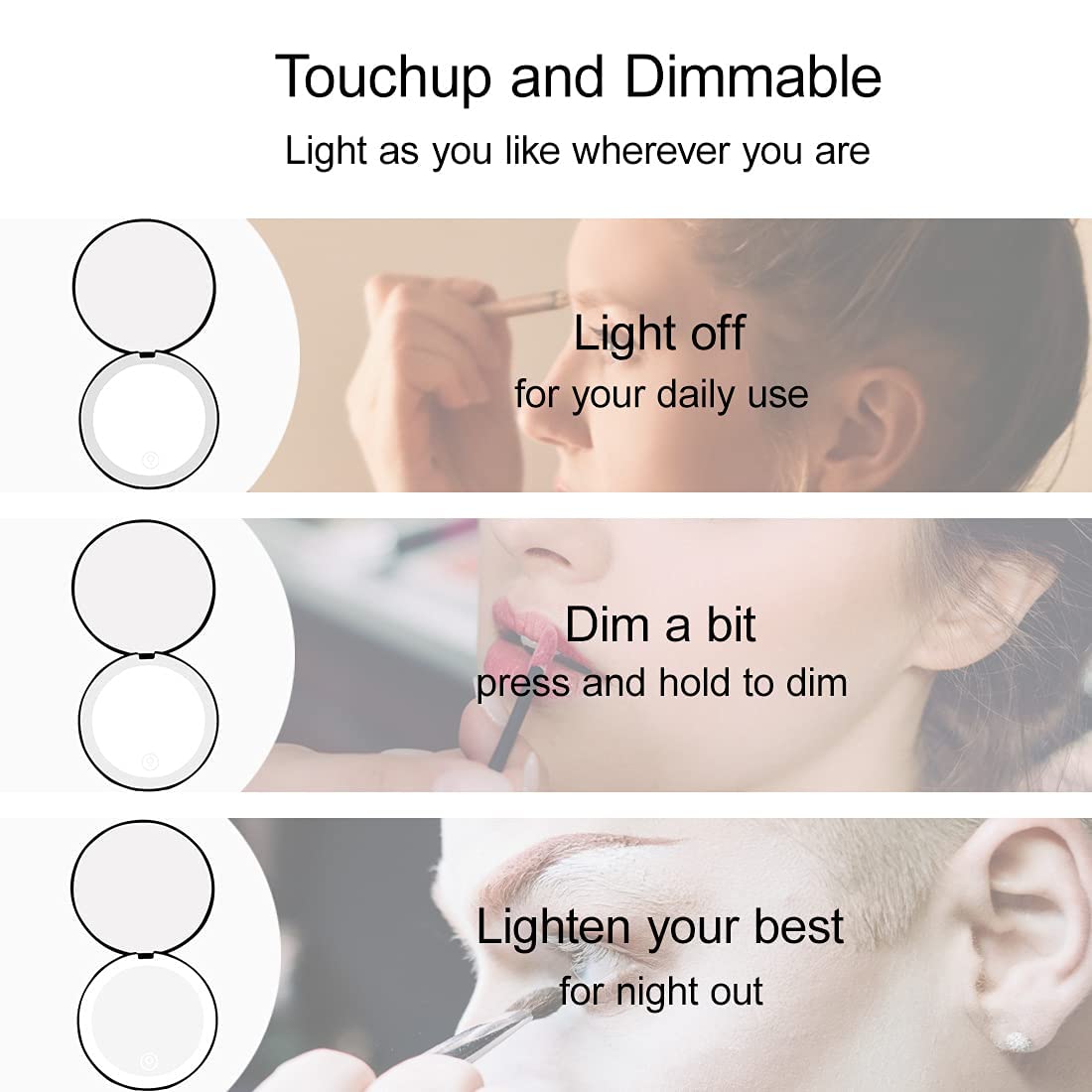 - 【Rechargeable LED Compact Mirror】: Lighted compact mirror with LED light is rechargeable. Soft LED ring light simulates daylight help you to create the flawless makeup. Elegant design for all the occasions such as daily use, party, date or travel.