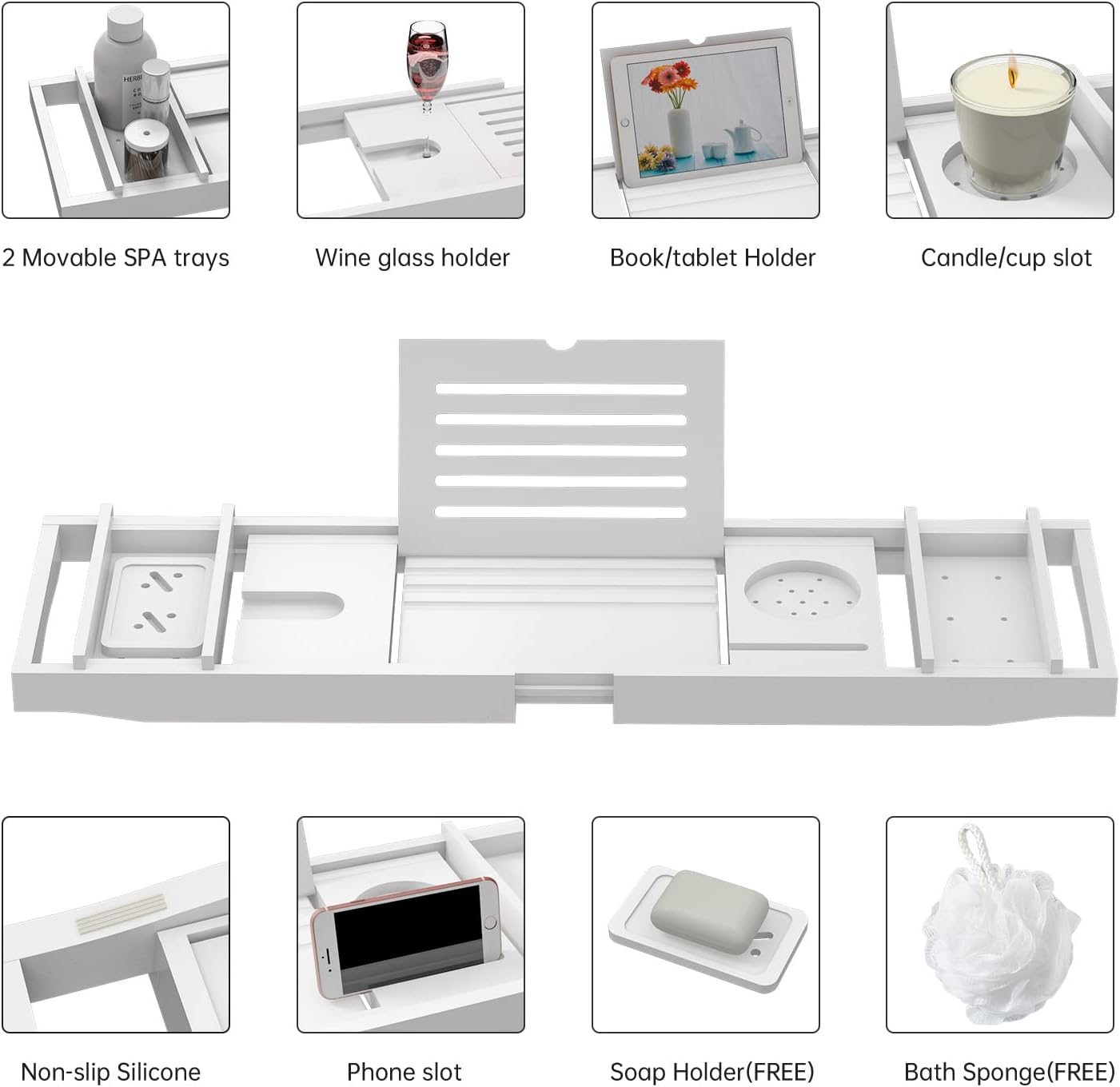 Zhuoyue Bamboo Bathtub Tray, Expandable Premium Bath Tray for Luxury Bathroom, Adjustable Bath Accessories for Tub with Soap Towel Book Holder, Extendable 29.5-43.3" White