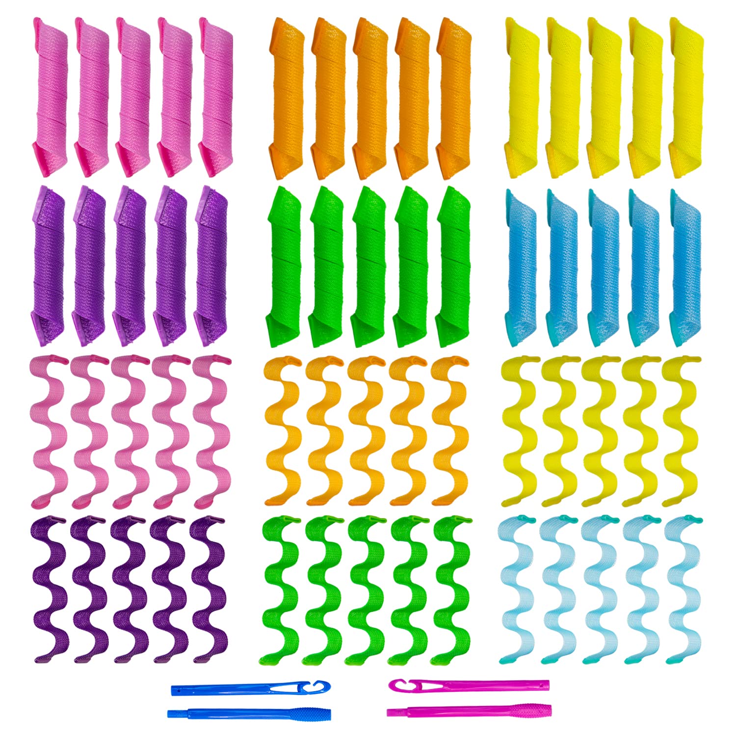 - Package includes: 30pcs Wave style hair curlers and 30pcs spiral heatless curls, pink orange blue green yellow and purple color, 2 sets of hair hooks (blue + pink).