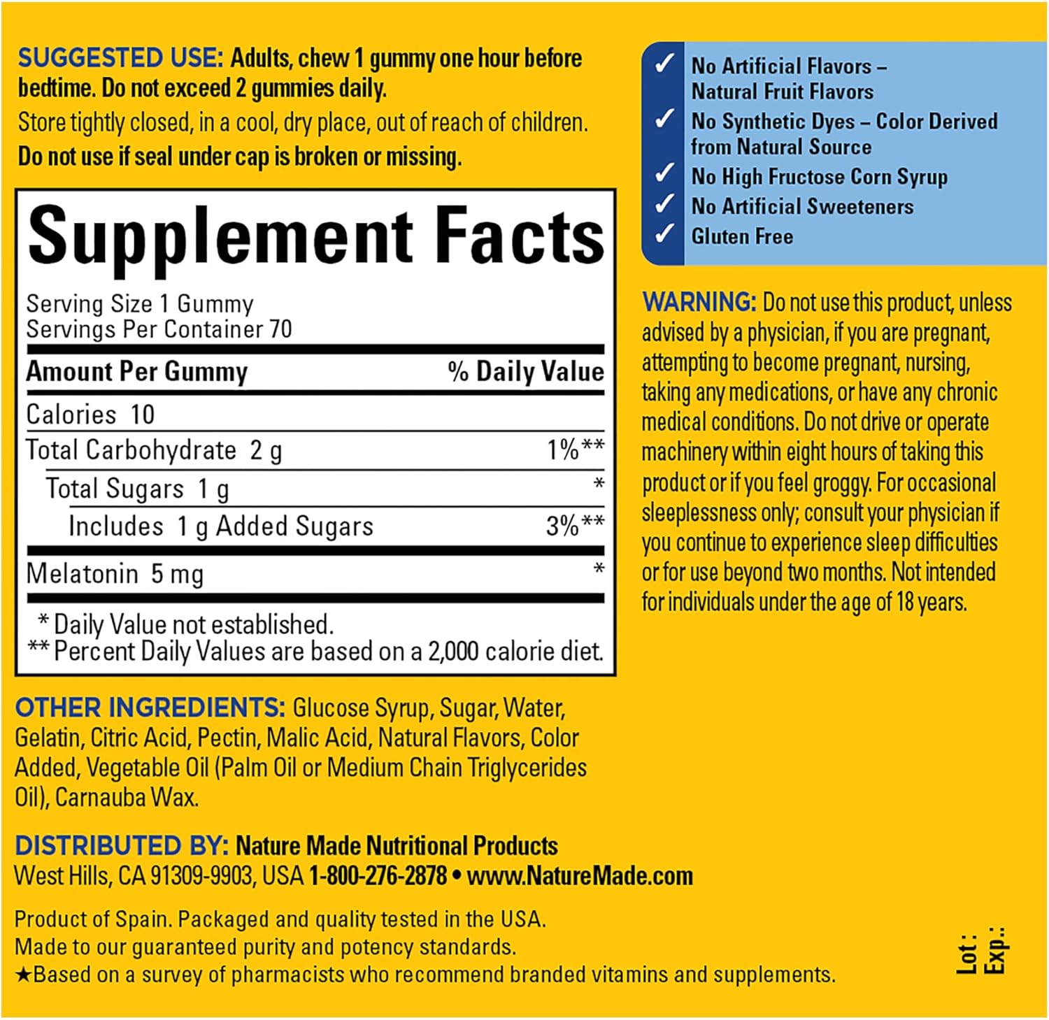 - Occasional use sleep support: Contains one 70 count bottle of Nature Made Melatonin 5 mg Extra Strength Gummies, a sleep aid supplement providing Melatonin 5mg gummies for a 70-day supply