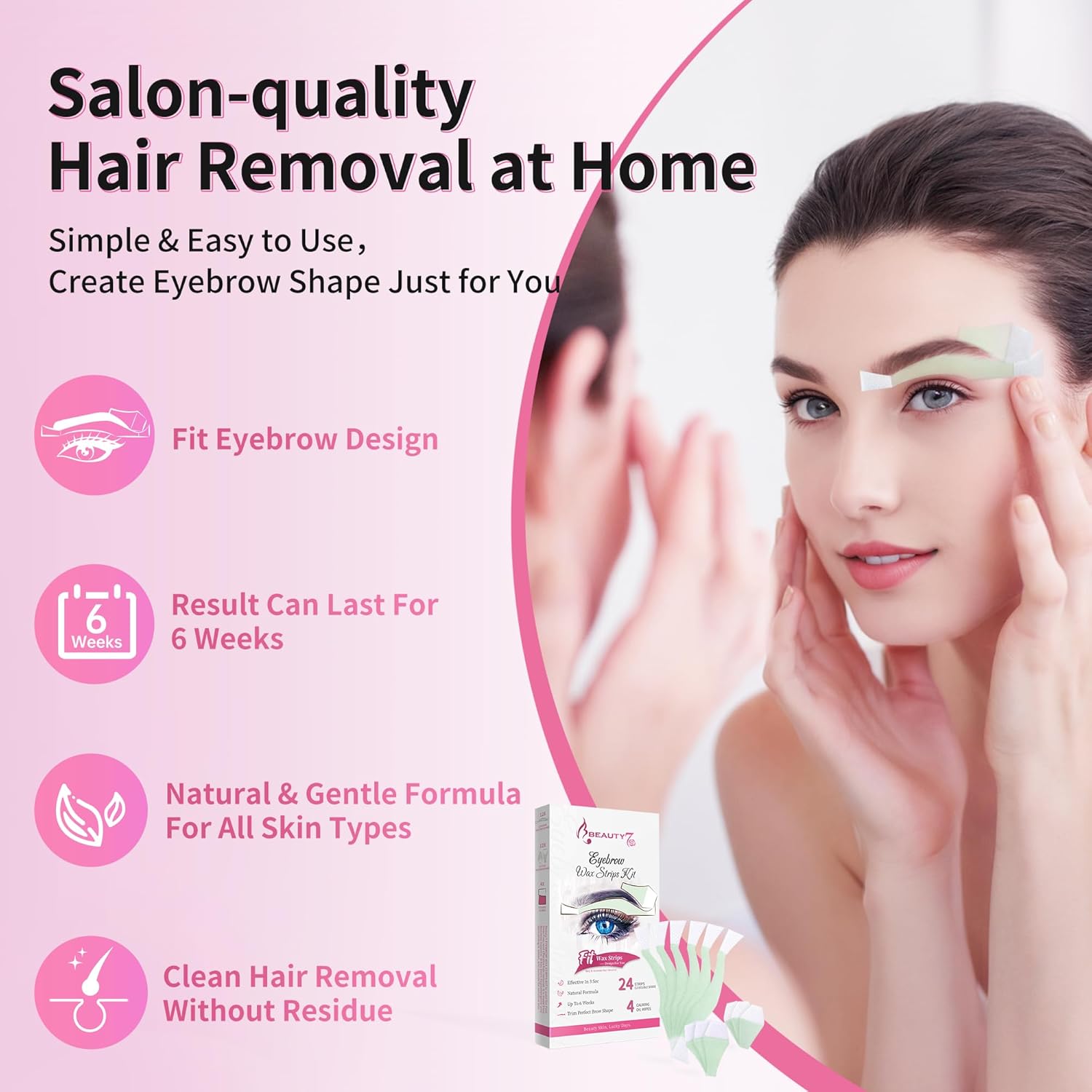 Beauty7 Facial Wax Strips Kit for Hair Removal - Eyebrow Shaper at Home - 24 Strips, 4 Calming Oil Wipes for Sensitive All Skin Types for Women
