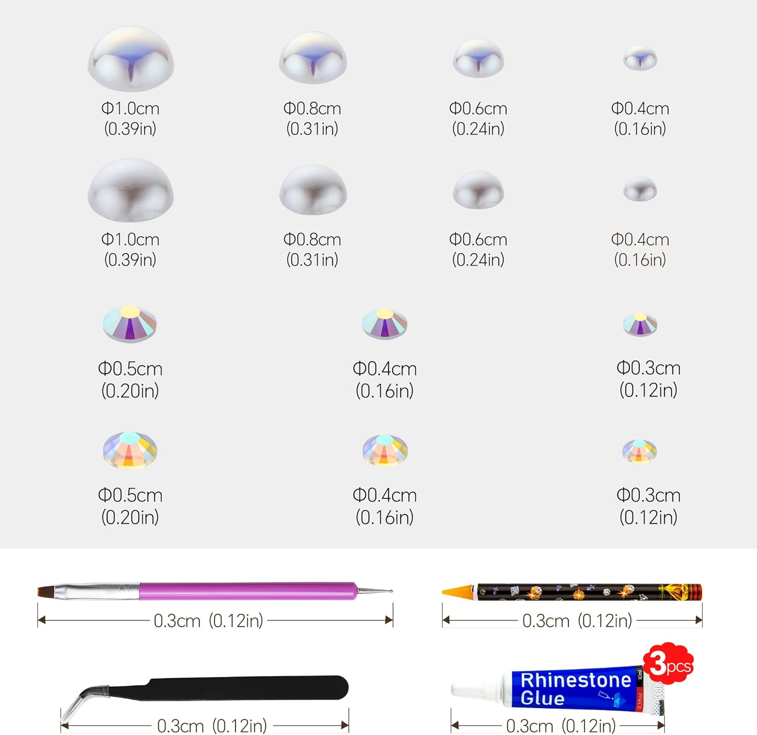 - What You Will Receive: 60g(30g*2)mixed size flat back pearls and rhinestones. 3*Rhinestone Glue. 1* wax pencil for rhinestones. 1*Pencil sharpener(color random). The mix half round pearls and rhinestones can make more beautiful handicrafts for your friends, parents, yourselfs on any festivals.If you need a mixed size pack of pearl rhinestones, search on Amazon:B0BBL1KVMD