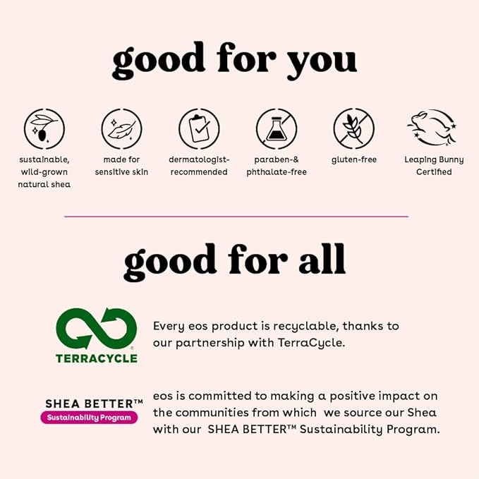 - SUSTAINABLE SHEA: Shea is a sustainable, renewable natural resource and through our Shea Better Sustainability program, eos is committed to making a positive impact on the communities from which we source our shea.