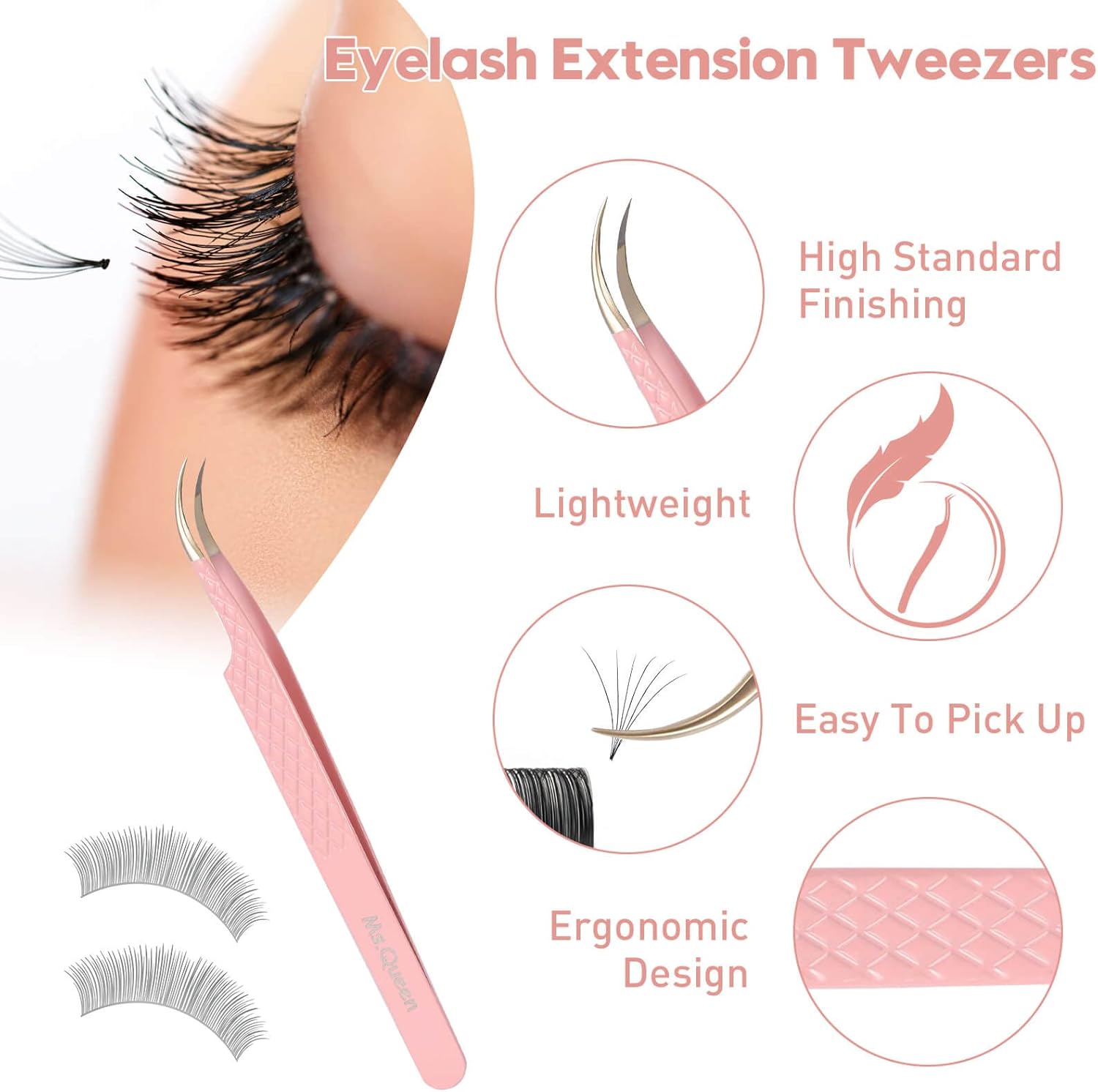 Ms.Queen Curved Tweezers for Eyelash Extensions,Diamond Grip Curved Volume Tweezers Fiber Tip Isolation Lash Tweezers