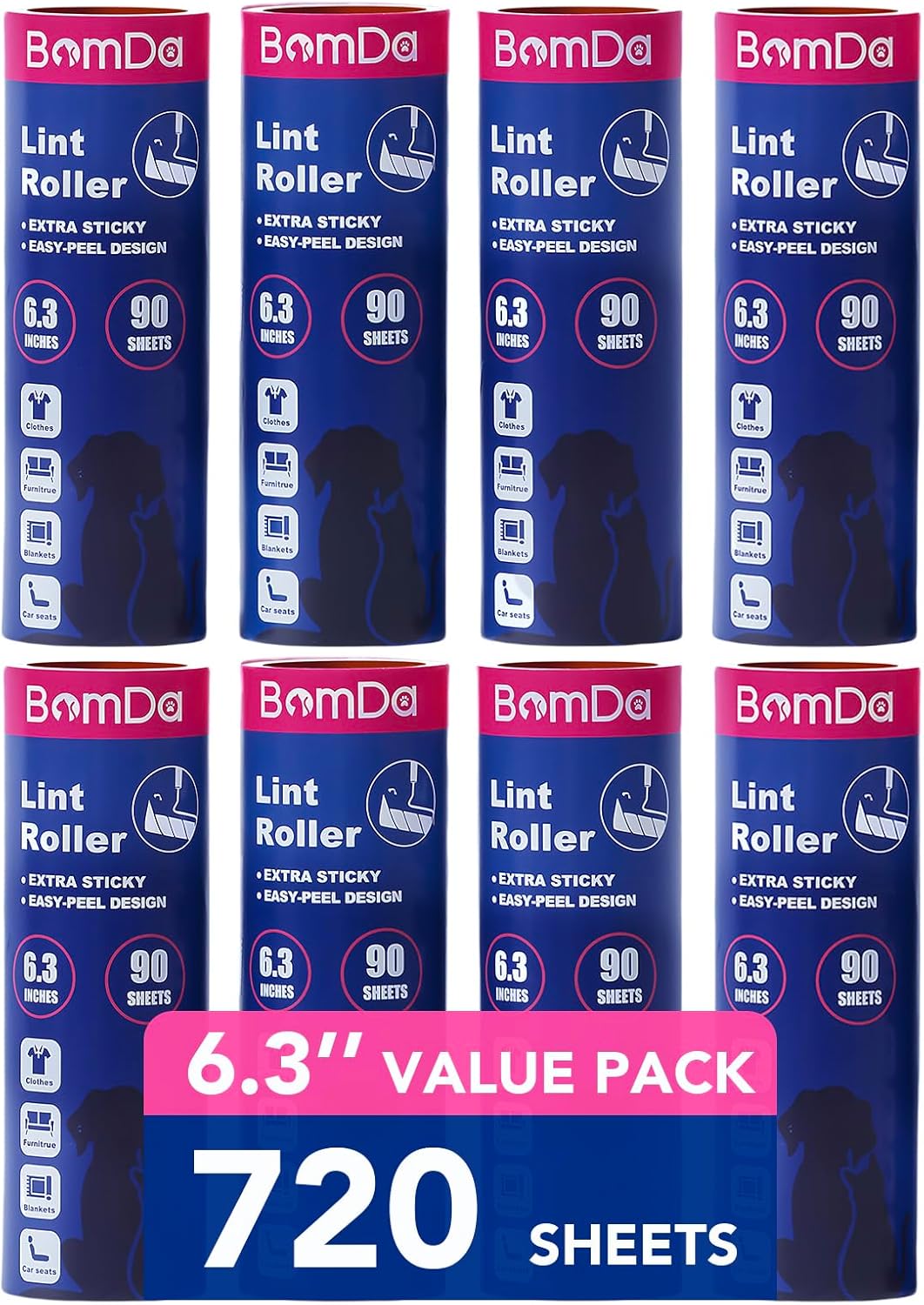 - MEGA VALUE SET : Economy value large lint roller for pet hair pack of 8 Refills, 720 Total Sheets in one package, 6.3inch/16cm Width.