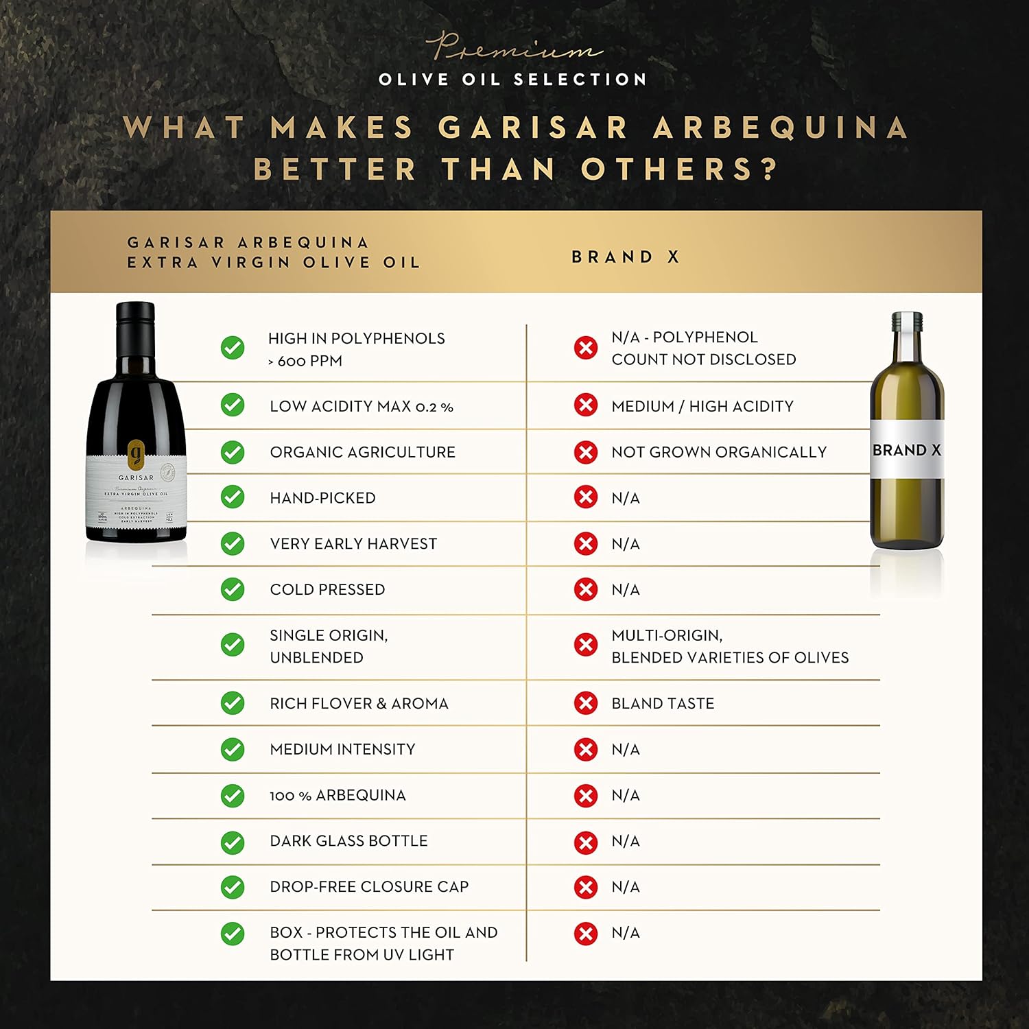 Garisar High In Polyphenol Premium Extra Virgin Olive Oil (>600 ppm), Low Acidity (max 0.2%), NYIOOC 2025 Gold Medal Winner, Organic Agriculture, Hand Picked, Cold Pressed, 100% Arbequina, Pack of 6