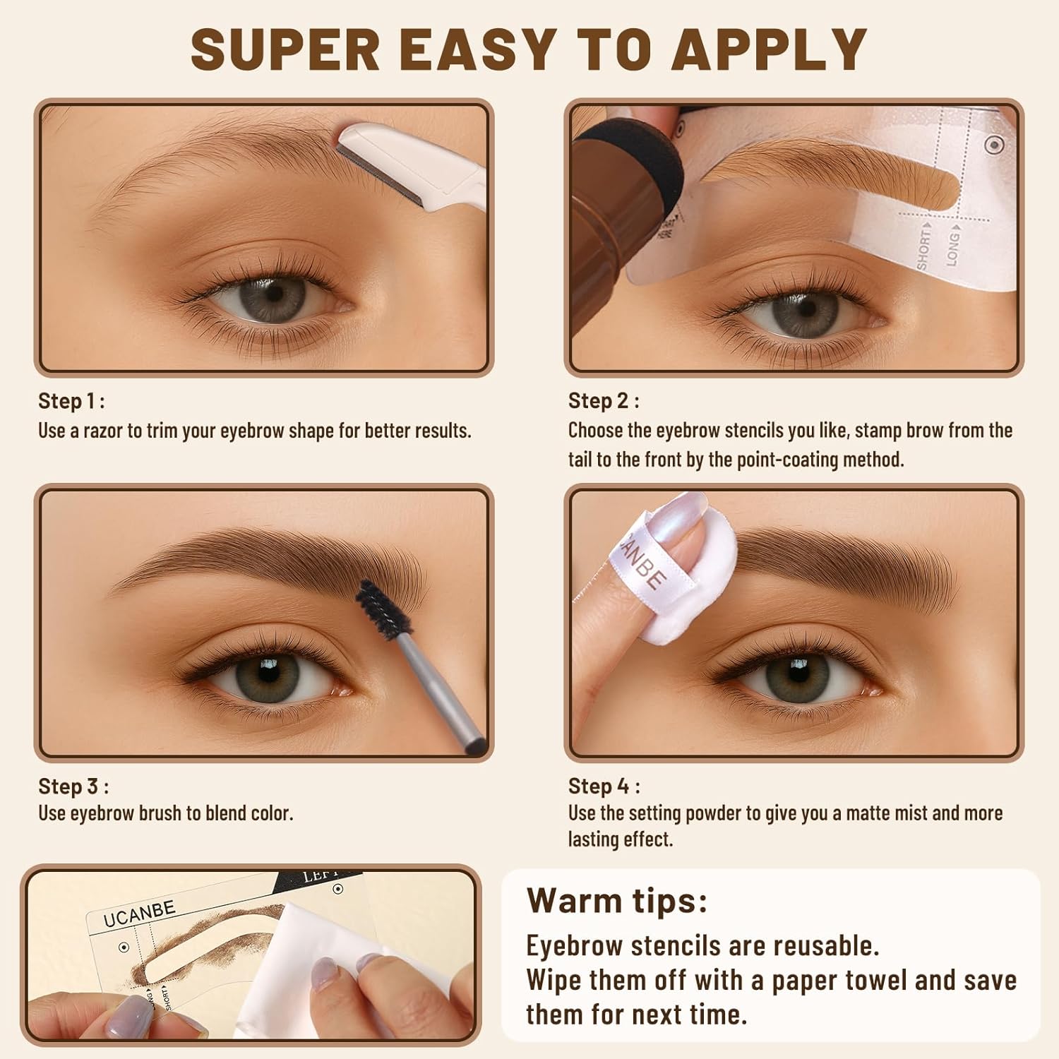 - 25PCS Eyebrow Stamp Stencil Kit: Includes 1 dual-color eyebrow stamp pomade, 20 reusable eyebrow stencils(10 pairs), 1 finising powder, 1 double-ended brush, 1 eyebrow razor and 1 zipper pouch for on the go. UCANBE eye brow stamping kit is designed for time-saving and ease of use, everyone can instantly create natural and attractive brows in seconds.