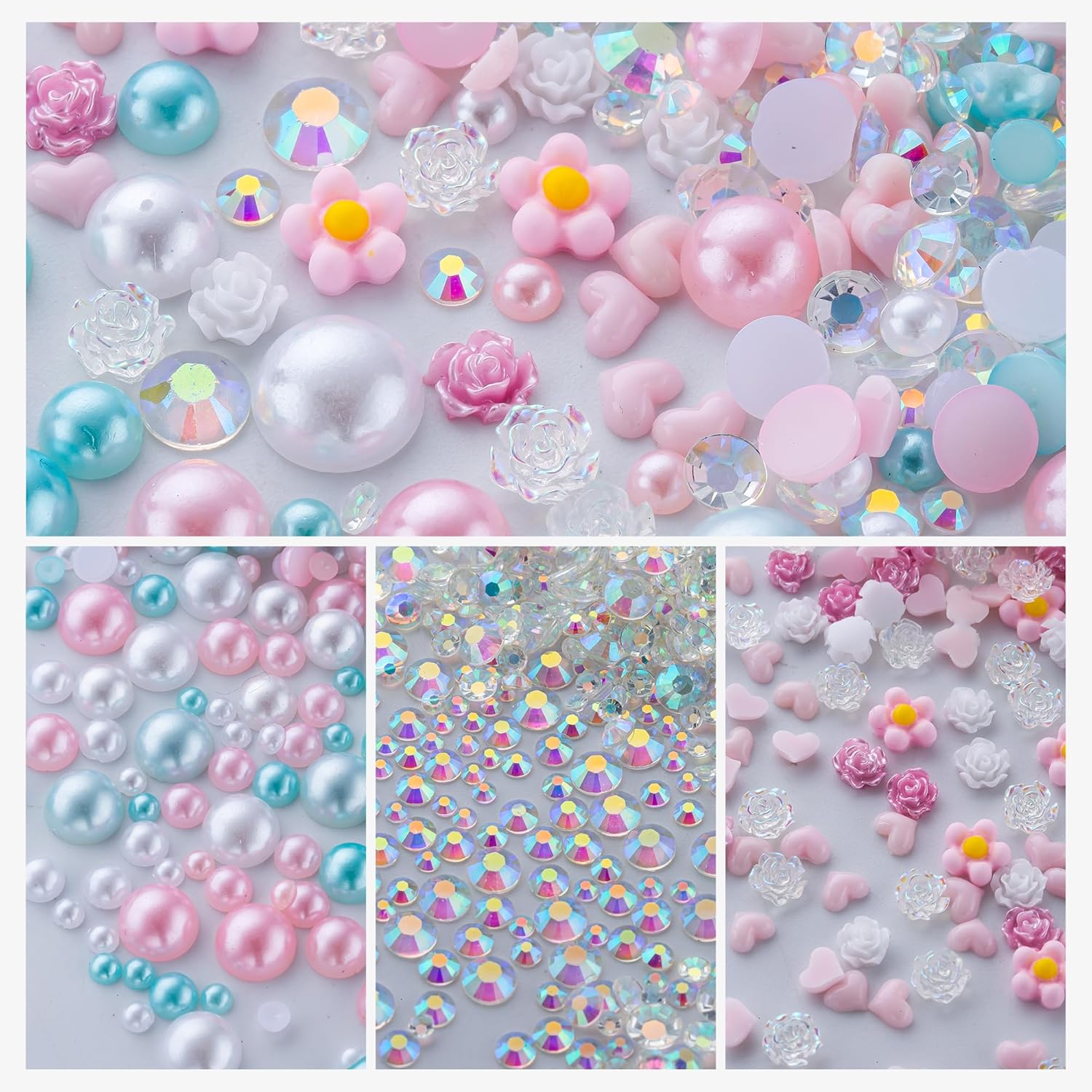 160g Cyan Pink Flat Back Pearls Rhinestones for Crafts Mixed Size 3mm-10mm AB Color Round Half Pearls Flatback Pearl Beads and Resin Rhinestones Set for Face Art