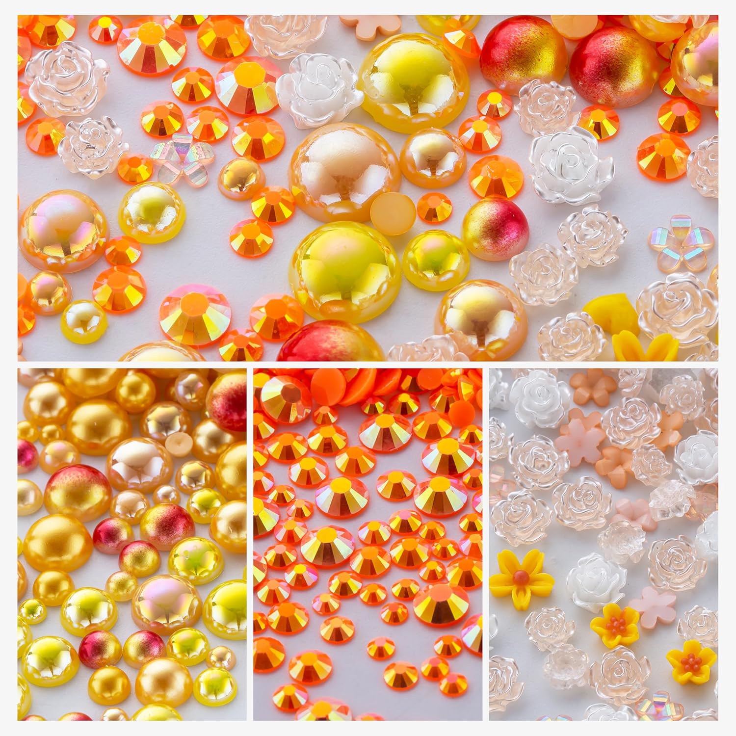 Sun Magic 160g Orange Flat Back Pearls Rhinestones for Crafts Mixed Size 3mm-10mm AB Color Round Half Pearls Flatback Pearl Beads and Resin Rhinestones Set for Face Art
