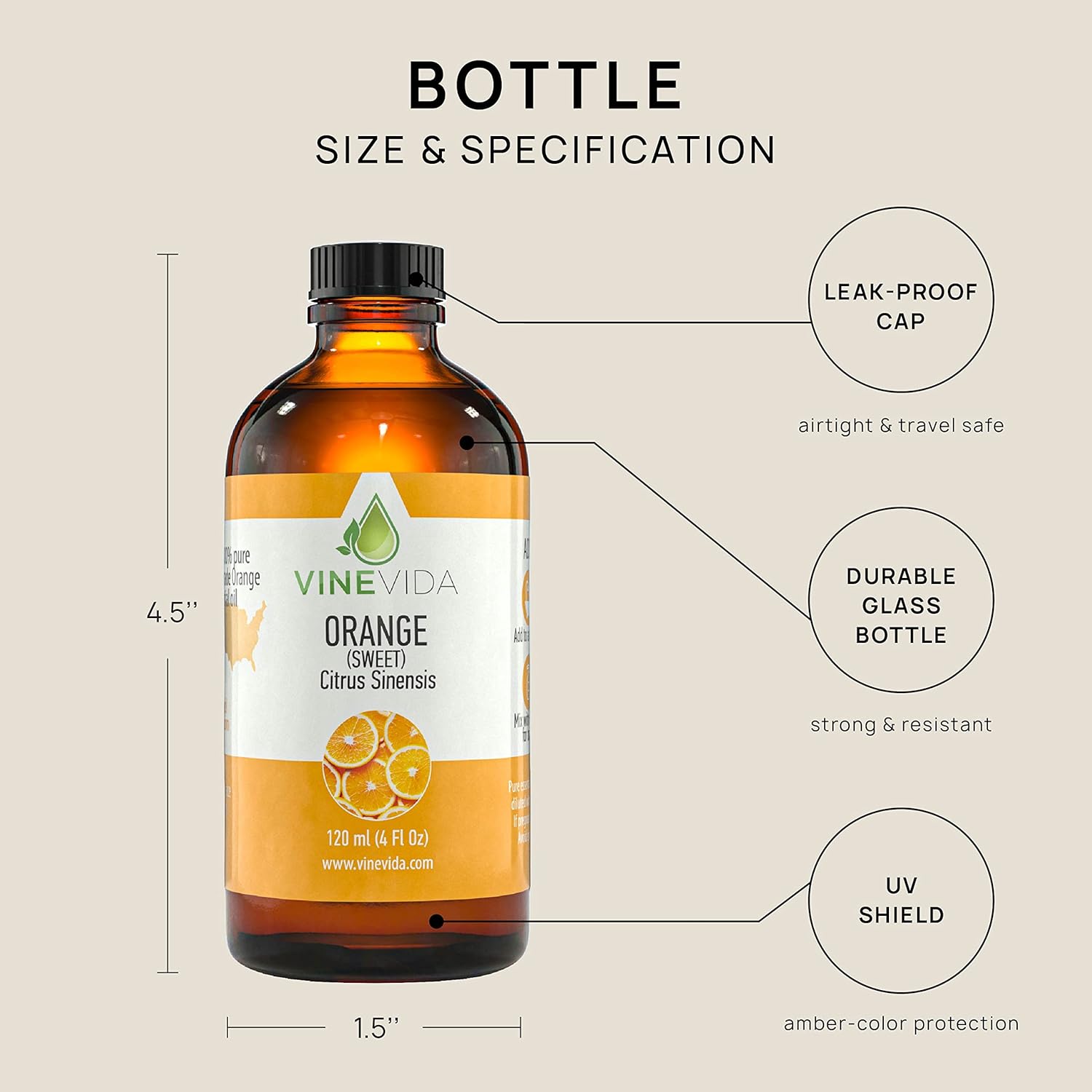 VINEVIDA Orange Sweet Essential Oil 4 oz - Undiluted Orange Oil 4 oz - Orange c- DIY Candle Scents for Candlemaking - Bulk Essential Oil for Soap Making Safe for Skin (4OZV-OBP-ORA-SWT-120ML)