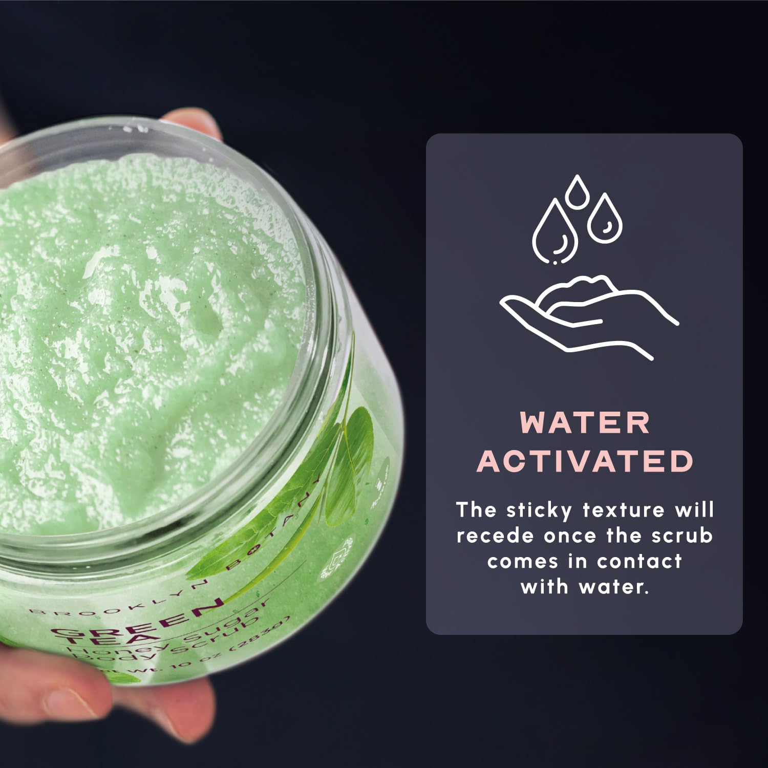 - WATER ACTIVATED – You will notice that the scrub has a sticky texture. Note that this is due to the presence of honey in the scrub and the stickiness will recede once it comes in contact with water.