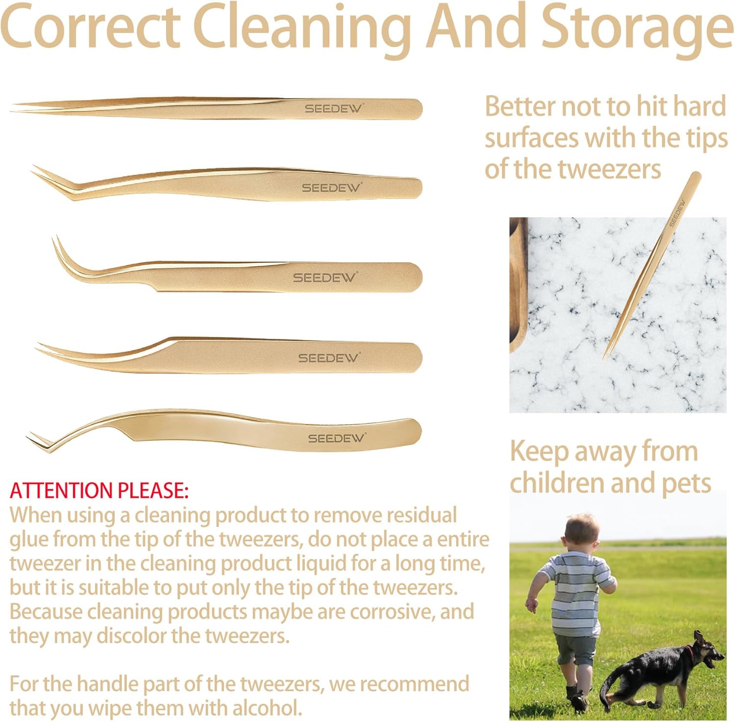 - âăPremium And ClassicăSEEDEW stainless steel golden tweezers have texture, smooth surface, classic and elegant style. 1 piece tweezer is equipped with a cover for the tip of the tweezer and a protective case, which is safe for storage, dustproof, dropproof, and imitation of poking.