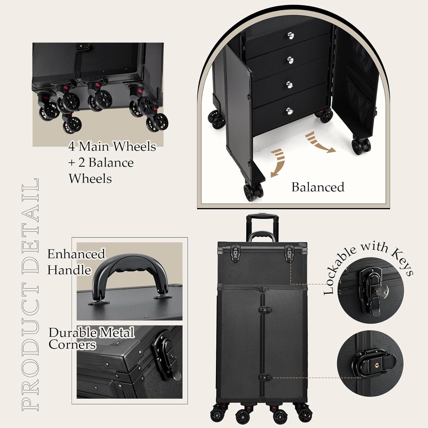 - Effortless Mobility Redefined: Experience true Portability with the 6-Wheel rolling makeup case. The telescopic handle and innovative 6-wheel design ensure smooth navigation, while the brakes on the wheels could hold it standing still. With locks that safeguard your cosmetics and tools, this case is about giving you the freedom to carry your beauty world wherever you go, securely and stylishly.