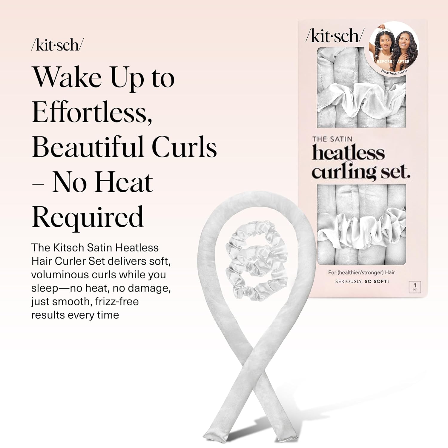 - BYE-BYE HAIR DAMAGE: Protect your hair from heat damage with the Kitsch Overnight Hair Curler. This set includes a curling rod and two satin scrunchies, all wrapped in premium satin fabric to keep your hair smooth and frizz-free while creating gorgeous, heat-free curls.
