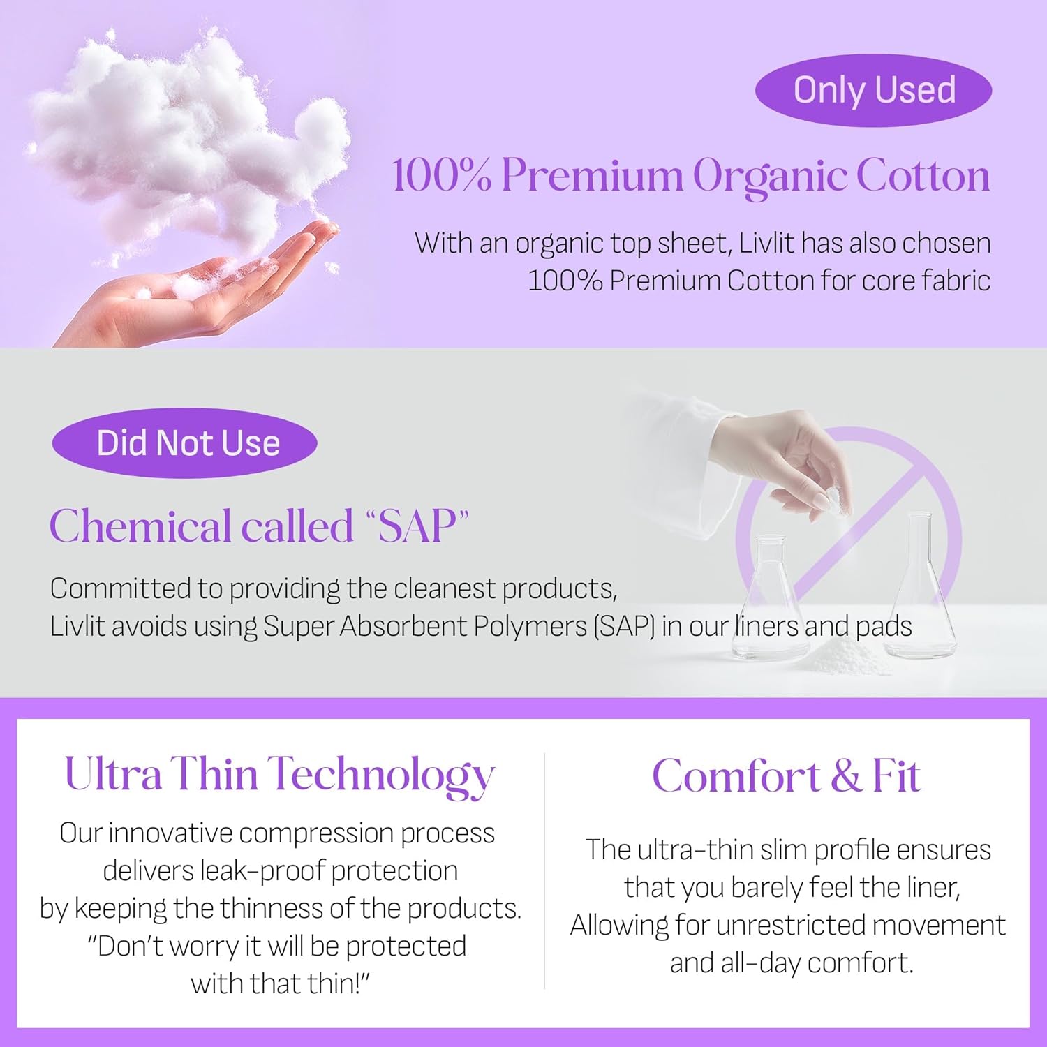 - PREMIUM ABSORBENCY: Elevate your period experience with Livlit organic pads and liners. Discover reliable, organic protection without compromising on performance. Exceptional absorbency for peace of mind.
