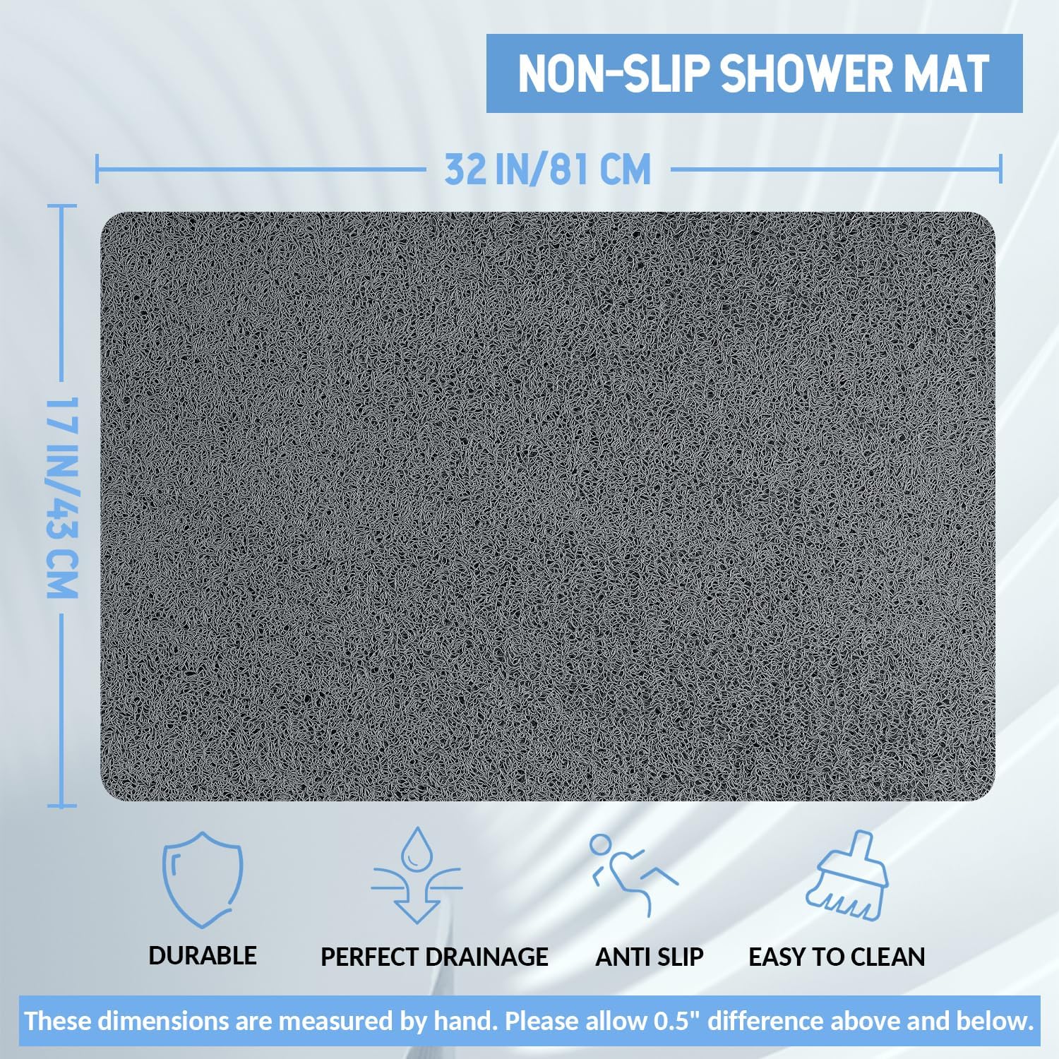 - 【Quick Drain & Perfect Size】The bath mat has hundreds of small drain holes to allow water to circulate. Water flows quickly through the bath mat without getting stuck. This mat measures 32*17 inches and fits most bathtubs. You can also cut the mat to any size and shape you need, so this mat will fit perfectly in any corner of your home.