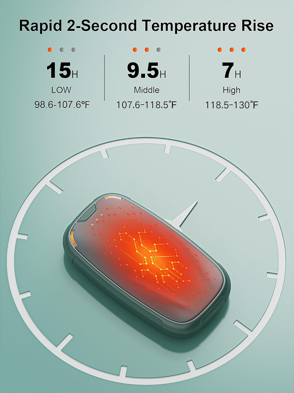 - 【Rechargeable & Three Levels of Temperature】Electric hand warmers, 5200mah rechargable hand warms with up to 12 hours battery life, USB hand warmer. With 3-speed indicator light, you can adjust three different temperatures, the use of time is 7-9.5-12 hours. Choose the right temperature for a comfortable using experience.