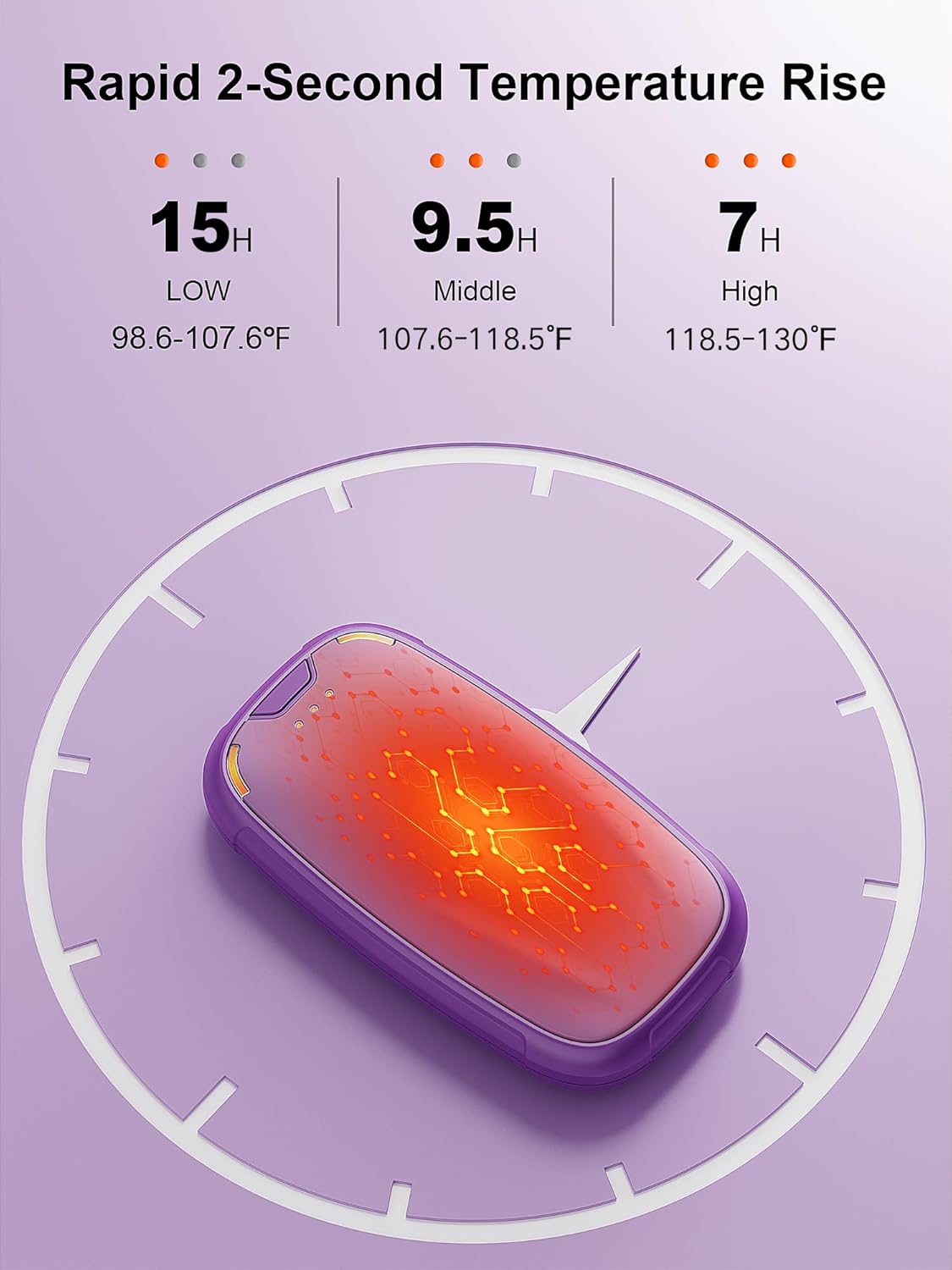 - 【Three Seconds Quick Heat】There is an on button on the top of the electric hand warmers rechargeable, press and hold for three seconds and the reusable hand warmer will turn on the heating to 105.8℉-114.8℉-125.6℉. Adjust the suitable temperature according to different temperature needs.
