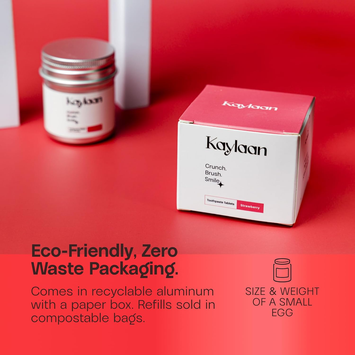 Kalyaan Kids Toothpaste Tablets with Fluoride | Whitening, Sensitivity Relief & Cavity Protection | Chewable, Plastic-Free, Travel-Friendly - Strawberry, 90 Count, Made in USA