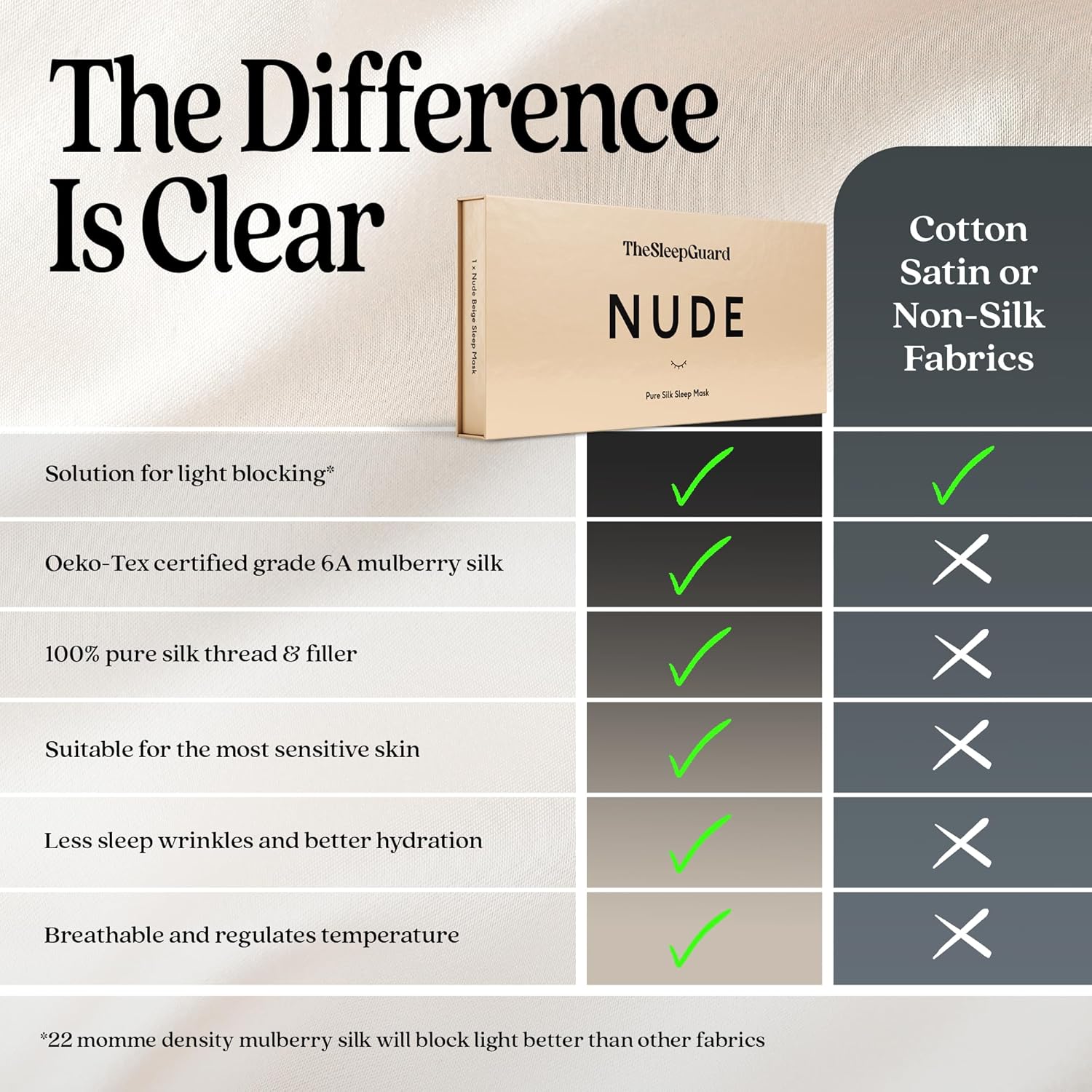 - ✅ INVEST IN YOUR SLEEP - Experience TheSleepGuard difference with our luxury sleeping masks. Crafted from the highest grade 6A Mulberry silk at 22 momme and certified by Oeko-Tex to ensure you sleep soundly. Remember, better sleep leads to a better you.