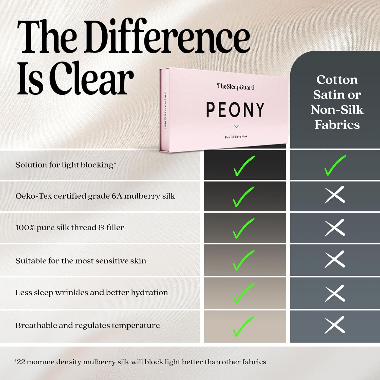 - ✅ INVEST IN YOUR SLEEP - Experience TheSleepGuard difference with our luxury sleeping masks. Crafted from the highest grade 6A Mulberry silk at 22 momme and certified by Oeko-Tex to ensure you sleep soundly. Remember, better sleep leads to a better you.