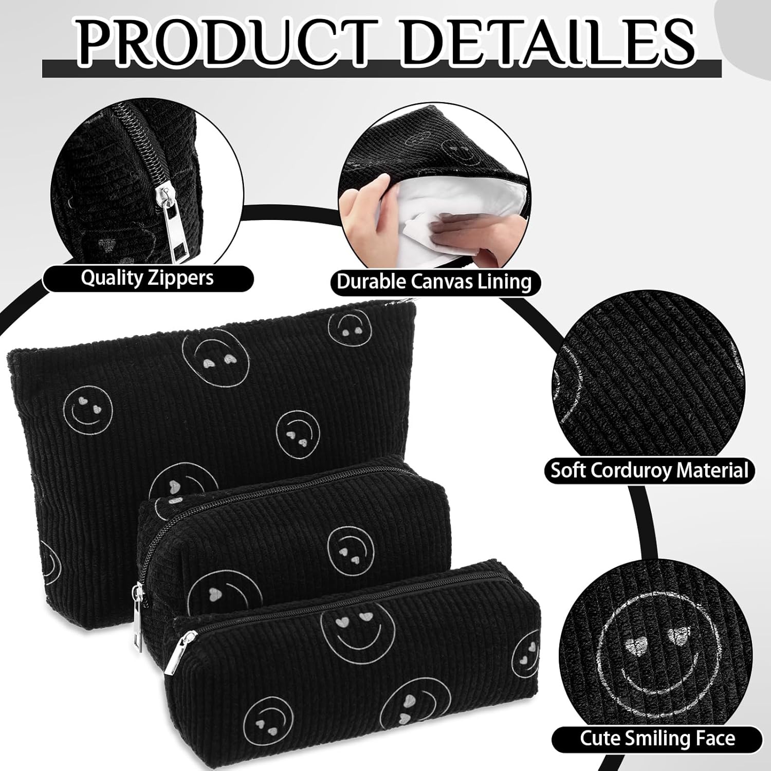 3 Pcs Makeup Bag Set for Women Corduroy Cosmetic Pouch Aesthetic Smile Travel Toiletry Bag Cute Purse Pouch Pencil Case Makeup Brushes Storage Organizer for Christmas(Black,Smile Face)