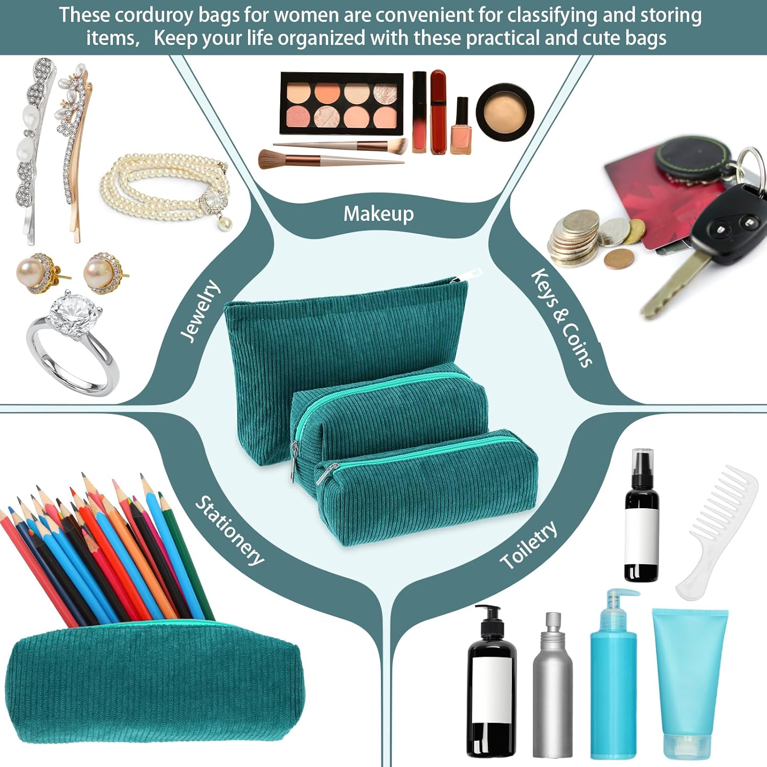 - Material and Attractive Design: the makeup and toiletry travel bag set is mainly crafted from quality corduroy material, ensuring high durability and prolonged service life; The bags feature solid dark green color design in different sizes; This makes them compatible with various styles of outfits
